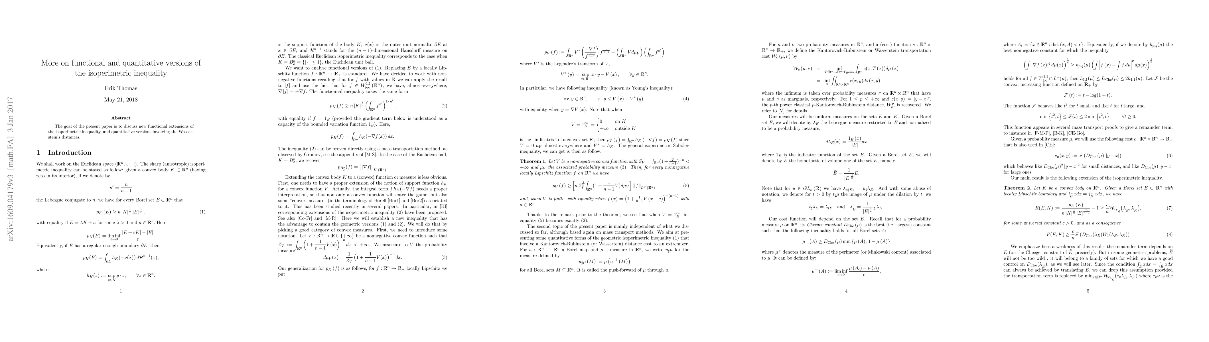 This paper presents new functional and quantitative forms of the isoperimetric inequality, utilizing optimal transportation and introducing a remainder term involving Wasserstein distance. The refined inequality is then applied to classical cases in convex geometry.