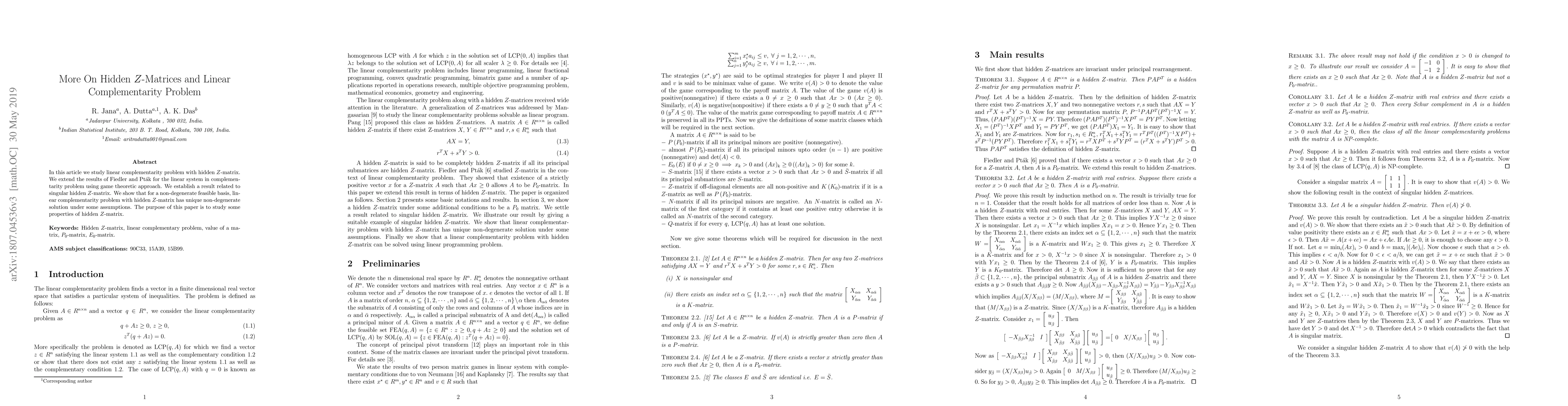 This paper extends Fiedler and Pták's results on linear complementarity problems using a game theoretic approach, focusing on hidden $Z$-matrices. It establishes properties of singular hidden $Z$-matrices and proves the uniqueness of non-degenerate solutions under certain assumptions for non-degenerate feasible bases.