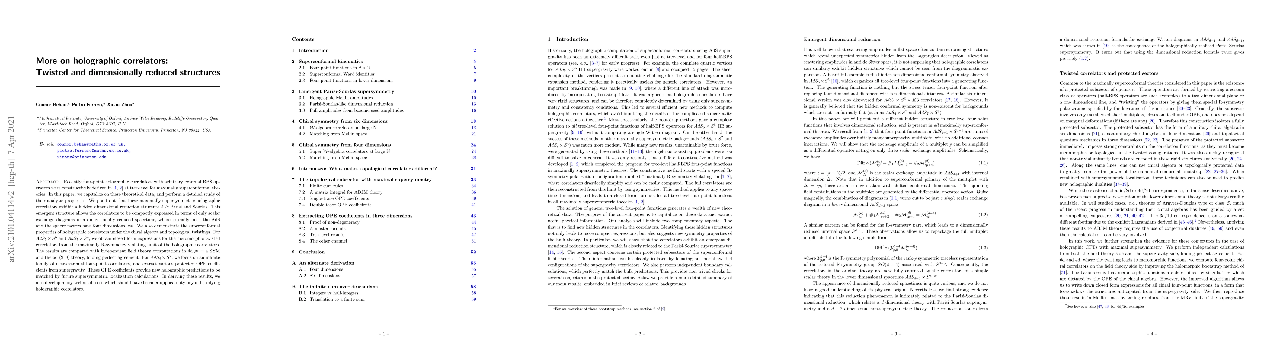 Recently four-point holographic correlators with arbitrary external BPS operators were constructively derived in [1,2] at tree-level for maximally superconformal theories. In this paper, we capitalize on these theoretical data, and perform a detailed study of their analytic properties. We point out that these maximally supersymmetric holographic correlators exhibit a hidden dimensional reduction structure \`a la Parisi and Sourlas. This emergent structure allows the correlators to be compactly expressed in terms of only scalar exchange diagrams in a dimensionally reduced spacetime, where formally both the AdS and the sphere factors have four dimensions less. We also demonstrate the superconformal properties of holographic correlators under the chiral algebra and topological twistings. For $AdS_5\times S^5$ and $AdS_7\times S^4$, we obtain closed form expressions for the meromorphic twisted correlators from the maximally R-symmetry violating limit of the holographic correlators. The results are compared with independent field theory computations in 4d $\mathcal{N}=4$ SYM and the 6d $(2,0)$ theory, finding perfect agreement. For $AdS_4\times S^7$, we focus on an infinite family of near-extremal four-point correlators, and extract various protected OPE coefficients from supergravity. These OPE coefficients provide new holographic predictions to be matched by future supersymmetric localization calculations. In deriving these results, we also develop many technical tools which should have broader applicability beyond studying holographic correlators.