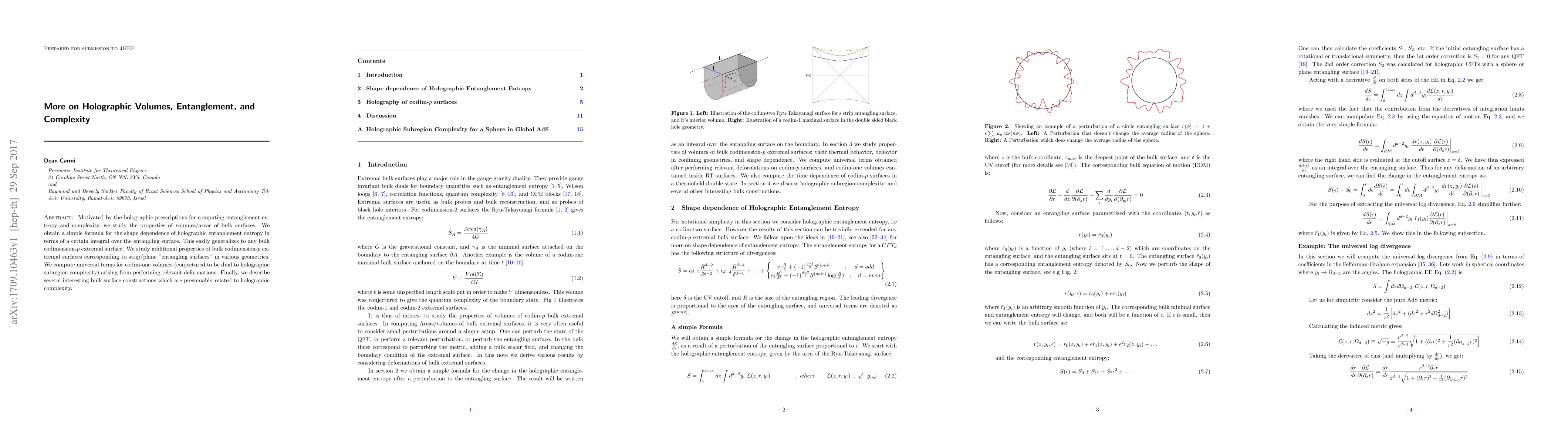 This paper explores the relationship between holographic volumes, entanglement entropy, and complexity, deriving a formula for the shape dependence of holographic entanglement entropy. It also investigates universal terms for codimension-one volumes and constructs bulk surfaces potentially linked to holographic complexity.