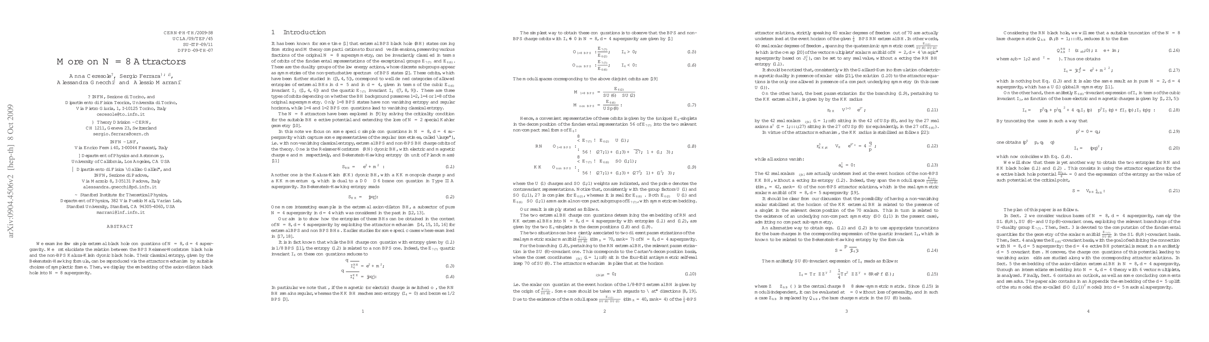 This paper investigates extremal black hole configurations in N=8, d=4 supergravity, clarifying the relationship between BPS Reissner-Nordstrom and non-BPS Kaluza-Klein black holes, and demonstrating how their classical entropy can be derived using the attractor mechanism. It also embeds the axion-dilaton black hole within the broader N=8 supergravity framework.
