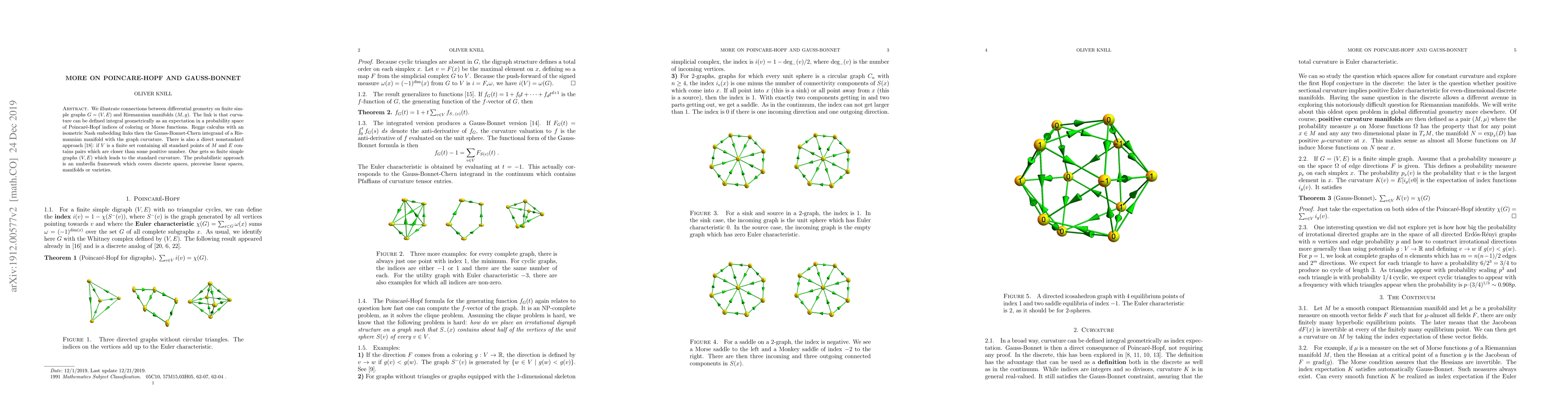 We illustrate connections between differential geometry on finite simple graphs G=(V,E) and Riemannian manifolds (M,g). The link is that curvature can be defined integral geometrically as an expectation in a probability space of Poincare-Hopf indices of coloring or Morse functions. Regge calculus with an isometric Nash embedding links then the Gauss-Bonnet-Chern integrand of a Riemannian manifold with the graph curvature. There is also a direct nonstandard approach: if V is a finite set containing all standard points of M and E contains pairs which are infinitesimally close in the sense of internal set theory, one gets a finite simple graph (V,E) which gets a curvature which as a measure corresponds to the standard curvature. The probabilistic approach is an umbrella framework which covers discrete spaces, piecewise linear spaces, manifolds or varieties.