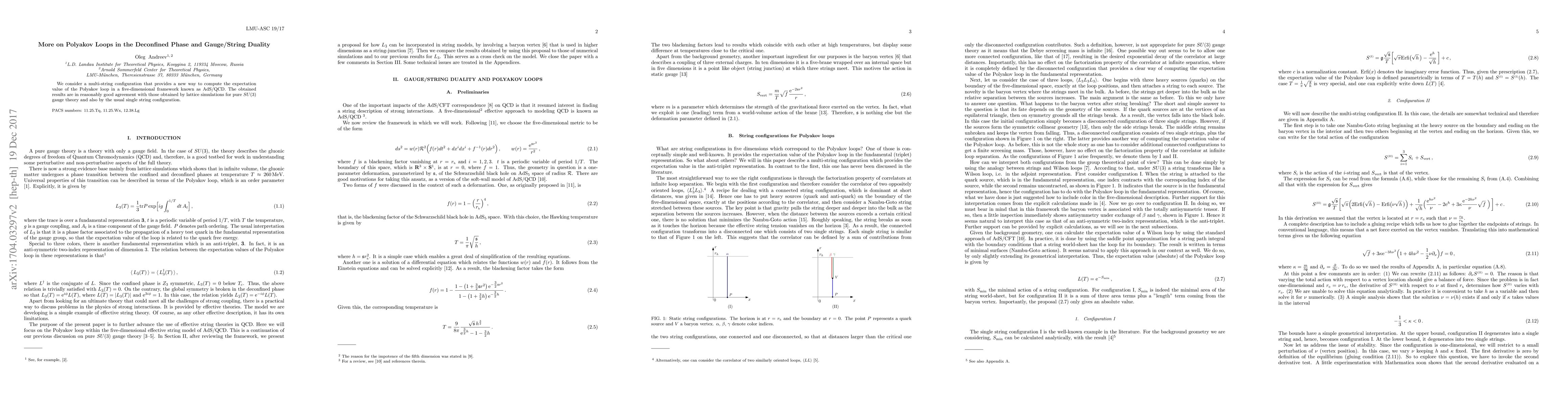 This paper explores a multi-string configuration to compute the Polyakov loop's expectation value in a five-dimensional AdS/QCD framework, finding results consistent with lattice simulations for pure SU(3) gauge theory and traditional single string methods.