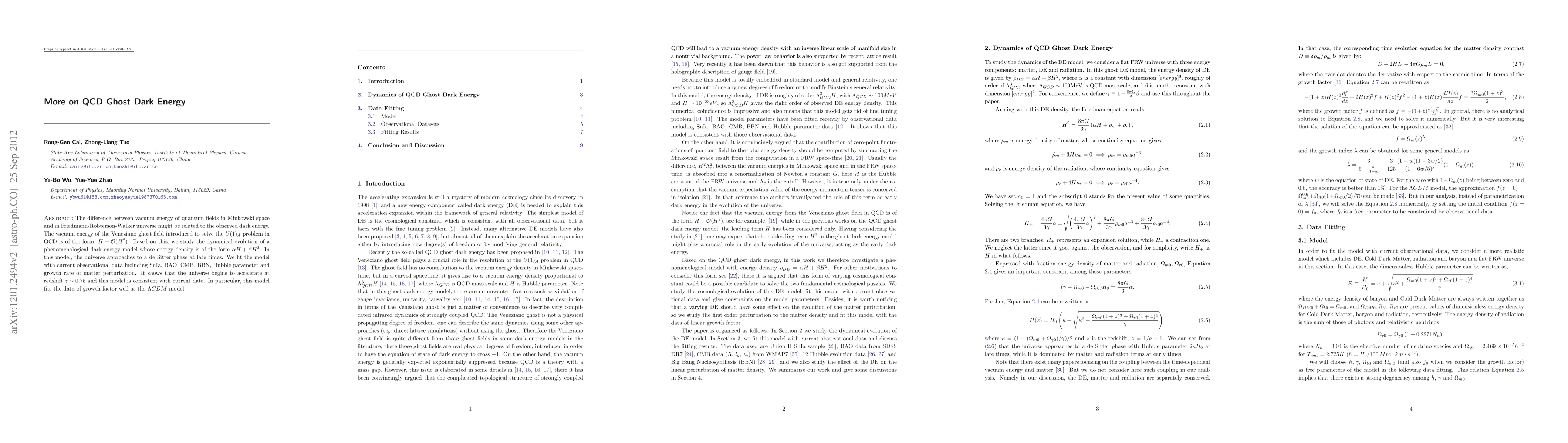 The difference between vacuum energy of quantum fields in Minkowski space and in Friedmann-Robterson-Walker universe might be related to the observed dark energy. The vacuum energy of the Veneziano ghost field introduced to solve the $U(1)_A$ problem in QCD is of the form, $ H+ {\cal O}(H^2)$. Based on this, we study the dynamical evolution of a phenomenological dark energy model whose energy density is of the form $\alpha H+\beta H^2$. In this model, the universe approaches to a de Sitter phase at late times. We fit the model with current observational data including SnIa, BAO, CMB, BBN, Hubble parameter and growth rate of matter perturbation. It shows that the universe begins to accelerate at redshift $z\sim 0.75$ and this model is consistent with current data. In particular, this model fits the data of growth factor well as the $\Lambda CDM$ model.
