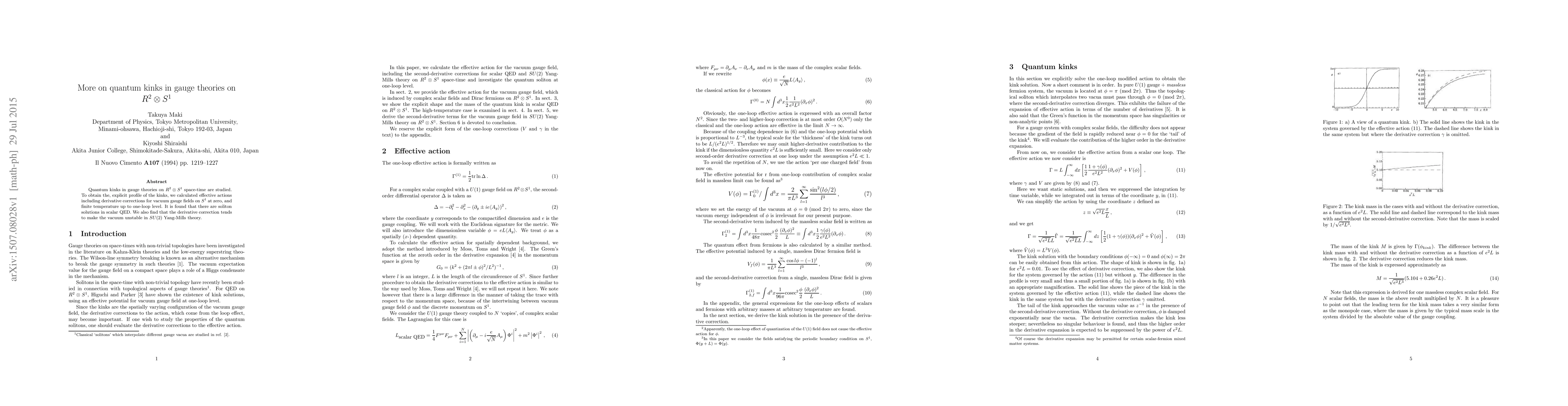 This paper investigates quantum kinks in gauge theories on $R^2 \otimes S^1$ space-time, deriving effective actions with derivative corrections. It finds soliton solutions in scalar QED and notes that derivative corrections destabilize the vacuum in $SU(2)$ Yang-Mills theory.