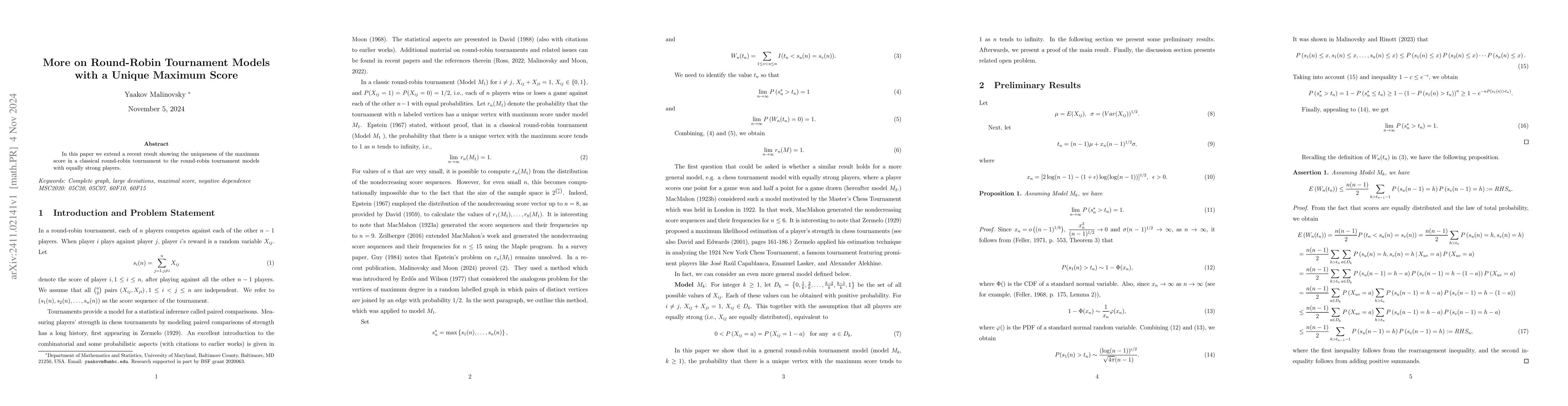 This paper extends the finding of a unique maximum score in classical round-robin tournaments to models where all players are equally strong, further solidifying the uniqueness of optimal performance in such settings.