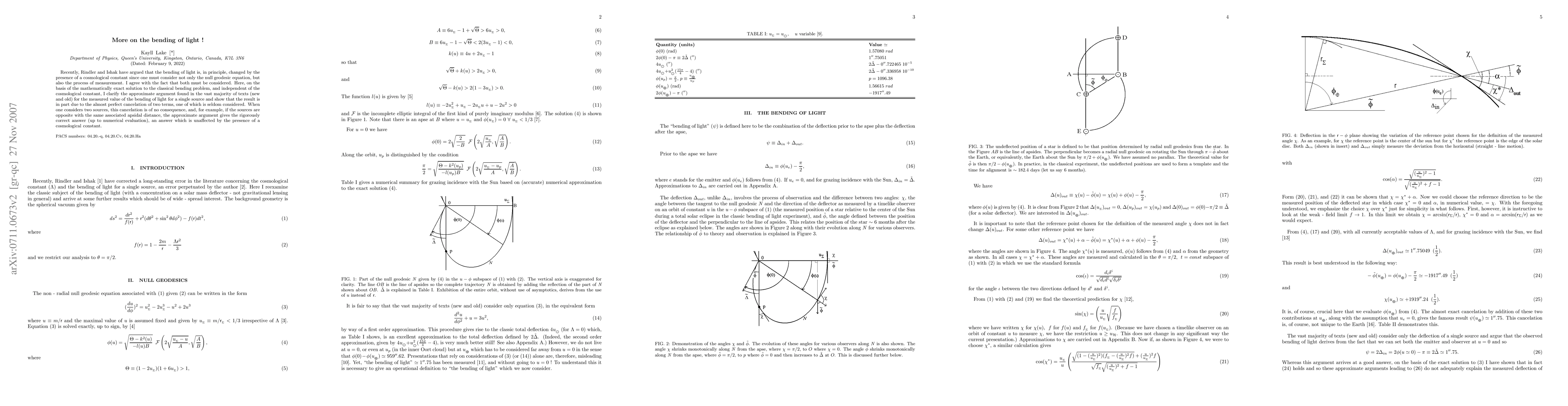 Recently, Rindler and Ishak have argued that the bending of light is, in principle, changed by the presence of a cosmological constant since one must consider not only the null geodesic equation, but also the process of measurement. I agree with the fact that both must be considered. Here, on the basis of the mathematically exact solution to the classical bending problem, and independent of the cosmological constant, I clarify the approximate argument found in the vast majority of texts (new and old) for the measured value of the bending of light for a single source and show that the result is in part due to the almost perfect cancelation of two terms, one of which is seldom considered. When one considers two sources, this cancelation is of no consequence, and, for example, if the sources are opposite with the same associated apsidal distance, the approximate argument gives the rigorously correct answer (up to numerical evaluation), an answer which is unaffected by the presence of a cosmological constant.