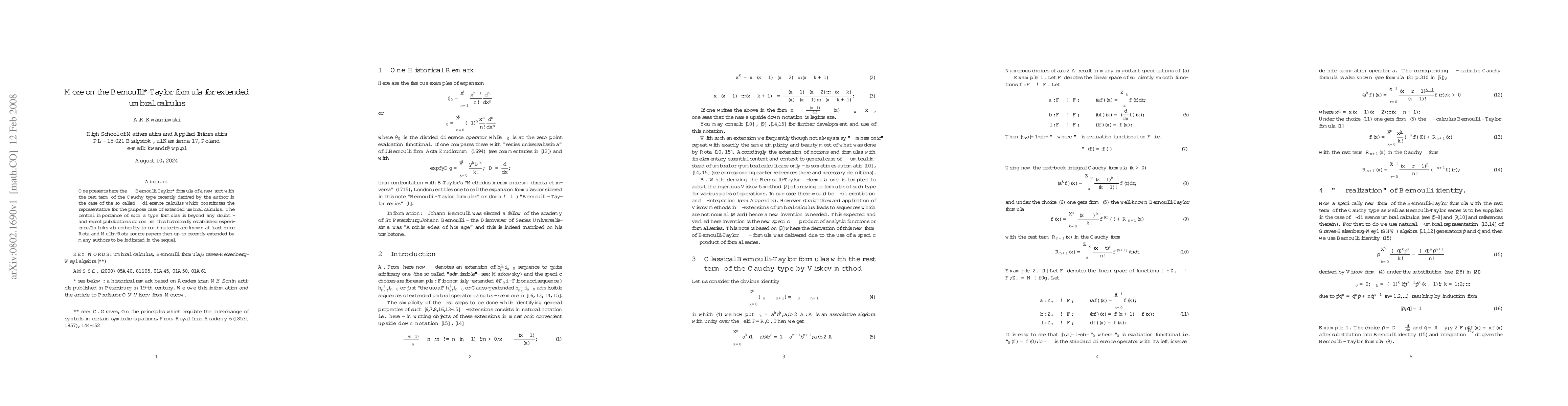 One delivers here the extended Bernoulli and Taylor formula of a new sort with the rest term of the Cauchy type recently derived by the author in the case of the so called $\psi$-difference calculus which constitutes the representative for the purpose case of extended umbral calculus. The central importance of such a type formulas is beyond any doubt. Recent publications do confirm this historically established experience. Its links via umbrality to combinatorics are known at least since Rota and Mullin source papers then up to recently extended by many authors to be indicated in the sequel.