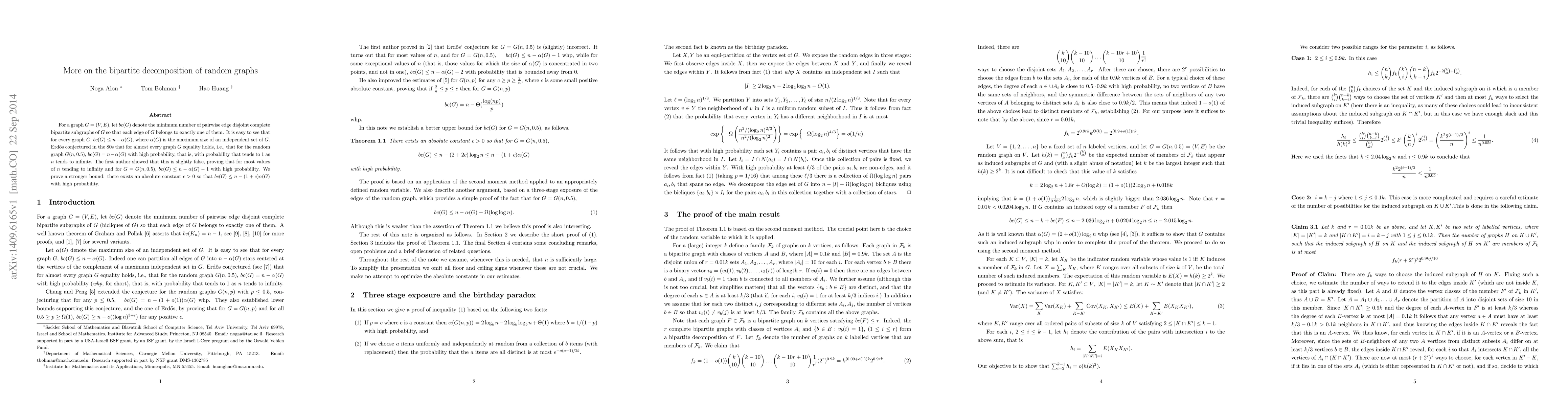 For a graph $G=(V,E)$, let $bc(G)$ denote the minimum number of pairwise edge disjoint complete bipartite subgraphs of $G$ so that each edge of $G$ belongs to exactly one of them. It is easy to see that for every graph $G$, $bc(G) \leq n -\alpha(G)$, where $\alpha(G)$ is the maximum size of an independent set of $G$. Erd\H{o}s conjectured in the 80s that for almost every graph $G$ equality holds, i.e., that for the random graph $G(n,0.5)$, $bc(G)=n-\alpha(G)$ with high probability, that is, with probability that tends to 1 as $n$ tends to infinity. The first author showed that this is slightly false, proving that for most values of $n$ tending to infinity and for $G=G(n,0.5)$, $bc(G) \leq n-\alpha(G)-1$ with high probability. We prove a stronger bound: there exists an absolute constant $c>0$ so that $bc(G) \leq n-(1+c)\alpha(G)$ with high probability.