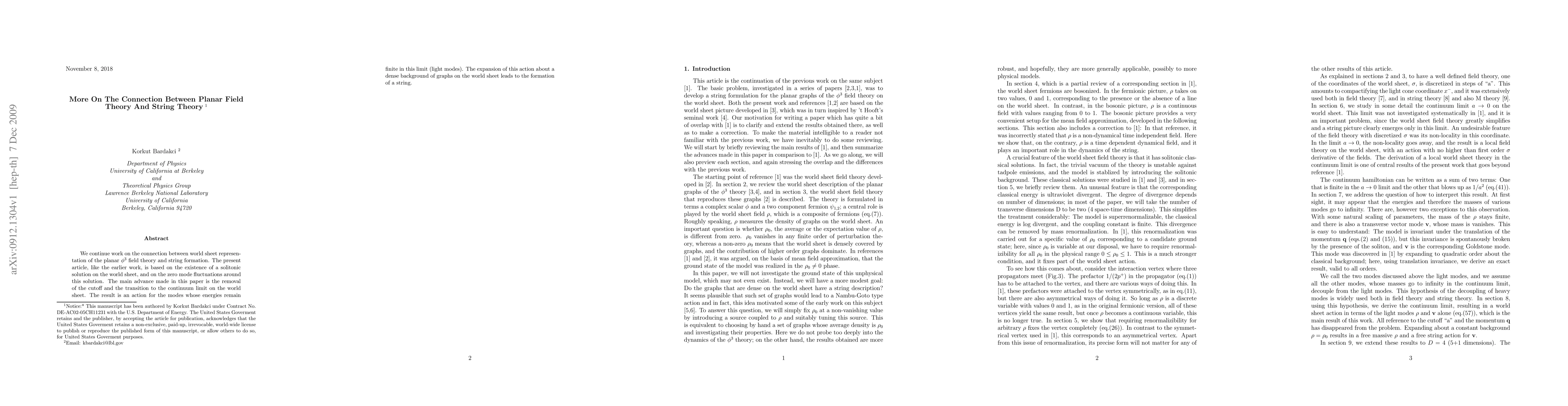 This paper explores the relationship between planar field theory and string theory by analyzing the world sheet representation of planar phi^3 theory, focusing on solitonic solutions and zero mode fluctuations. The key advancement is the transition to the continuum limit, resulting in a finite-energy action for light modes that leads to string formation.