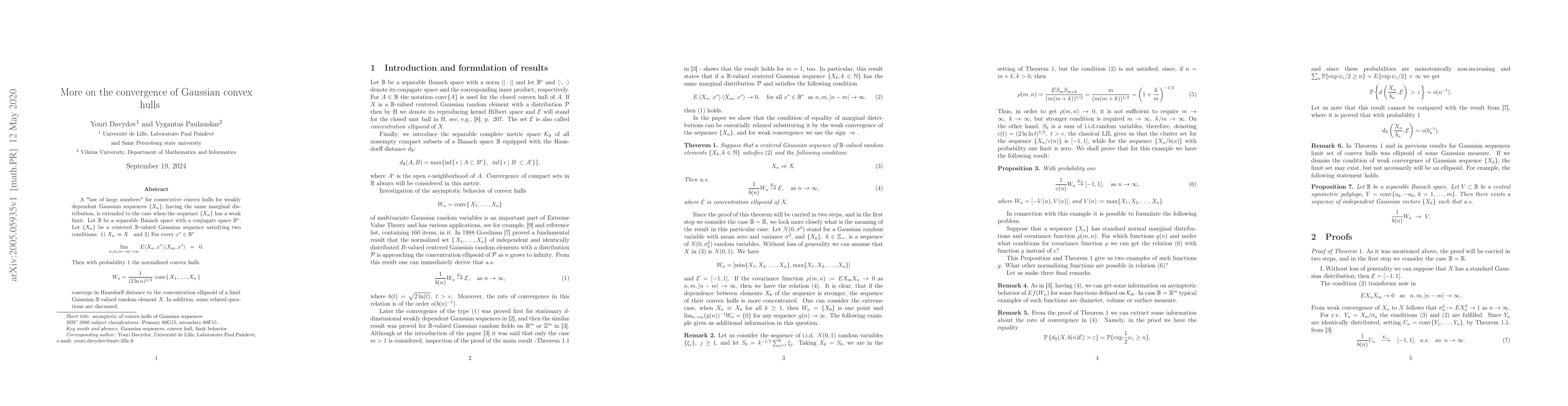 This paper extends a "law of large numbers" for Gaussian convex hulls to sequences with weak limits, showing that normalized convex hulls of weakly dependent Gaussian sequences converge in Hausdorff distance to the concentration ellipsoid of their limit Gaussian random element. Related questions are also explored.