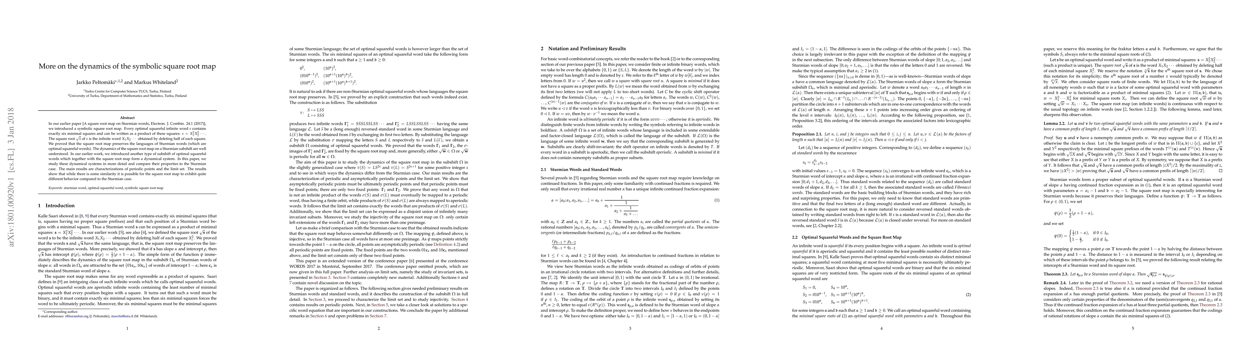 This paper delves into the dynamics of a symbolic square root map on subshifts of optimal squareful words, contrasting it with the well-understood dynamics on Sturmian subshifts. It characterizes periodic points and the limit set, revealing distinct behaviors despite some similarities.