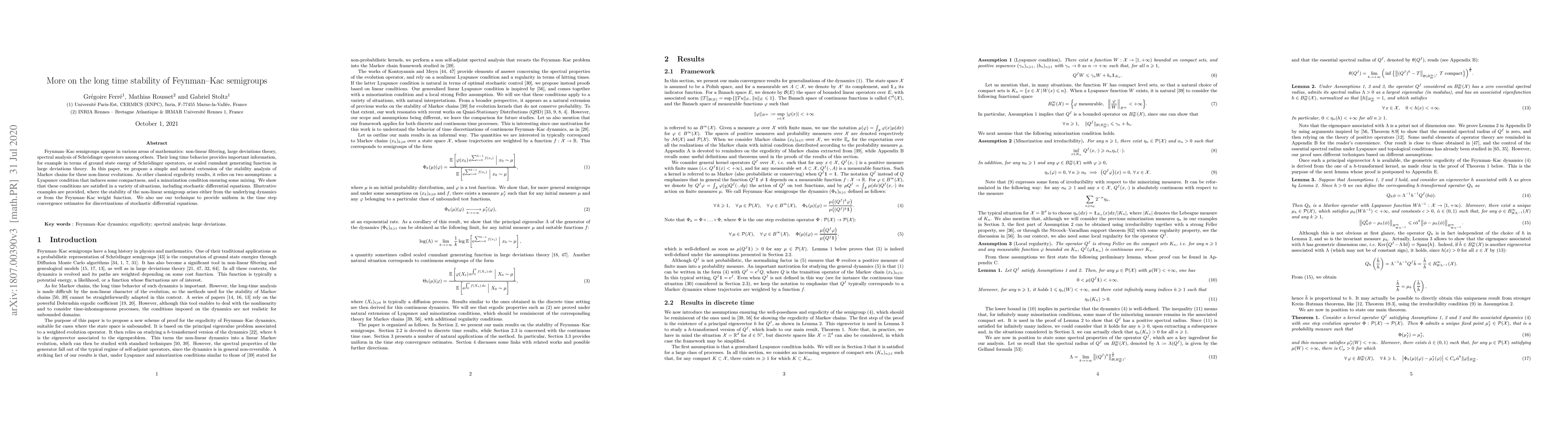 This paper extends the stability analysis of Feynman-Kac semigroups, crucial for understanding long-time behaviors in non-linear systems, by proposing a framework based on Lyapunov and minorization conditions. It also demonstrates the technique's effectiveness through examples and provides convergence estimates for stochastic differential equation discretizations.