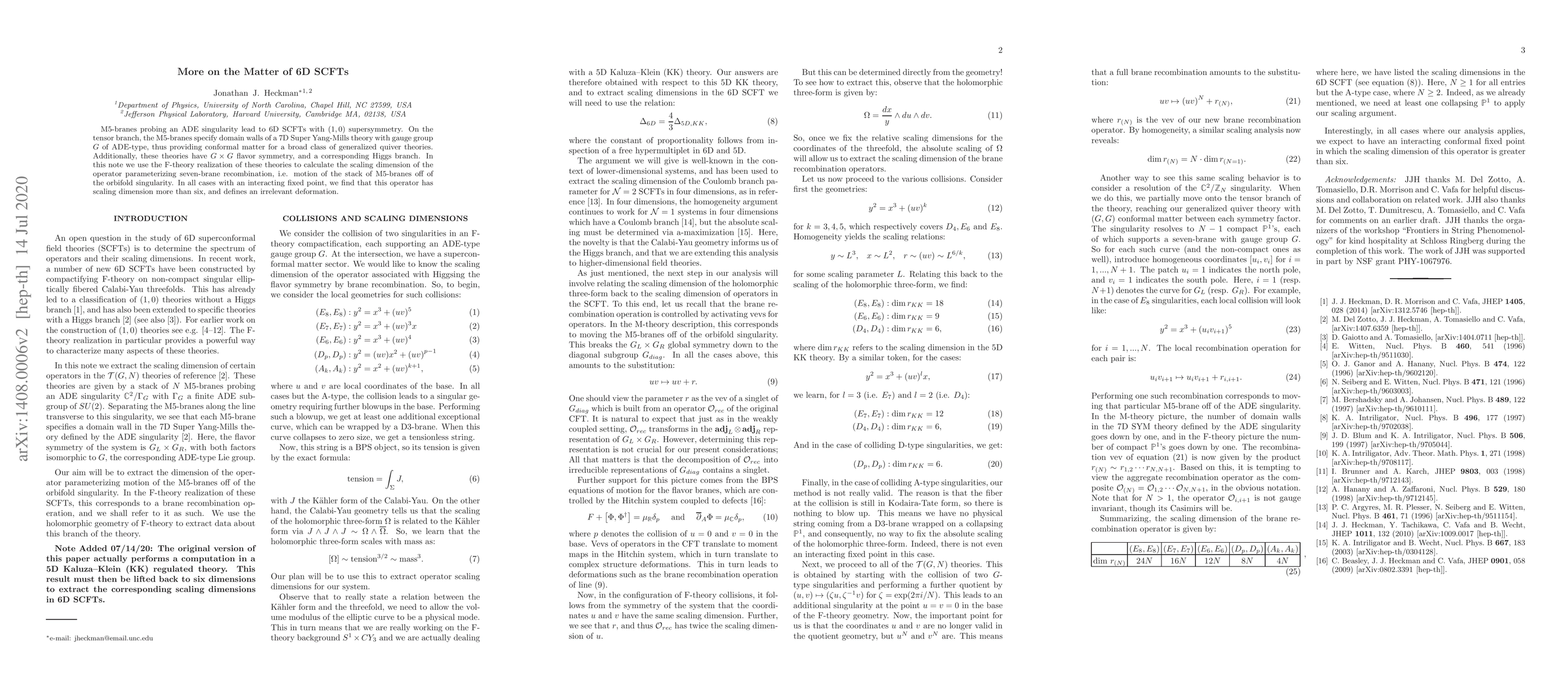 Researchers find that 6D SCFTs with (1,0) supersymmetry arise from M5-branes probing ADE singularities, leading to marginal irrelevant deformations in their scaling dimensions.