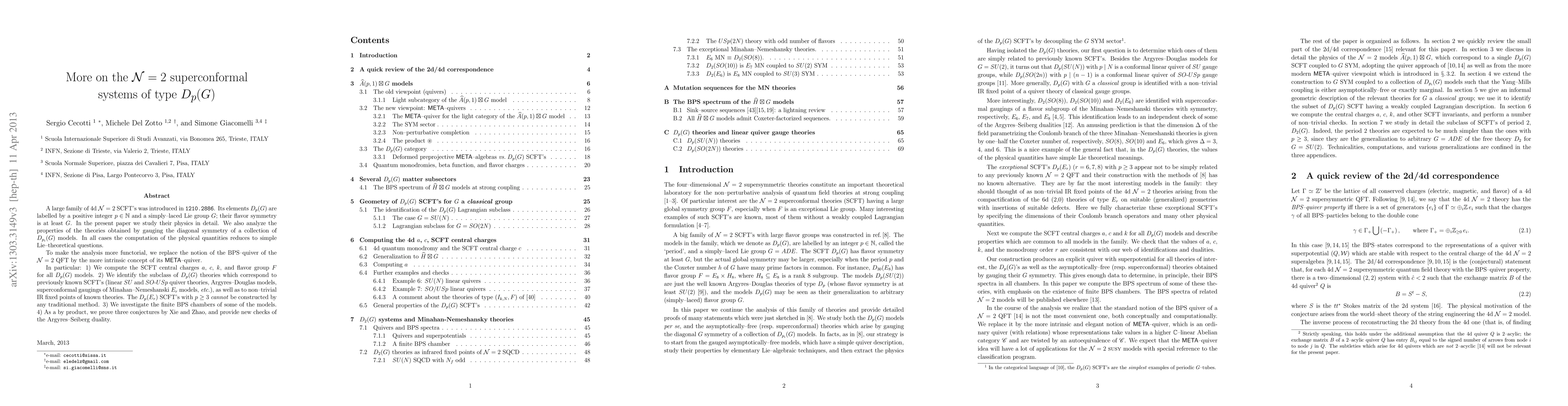Researchers studied 4d N=2 superconformal field theories (SCFTs) of type $D_p(G)$, computing central charges, identifying known SCFTs, and investigating finite BPS chambers, with implications for Argyres-Seiberg duality.