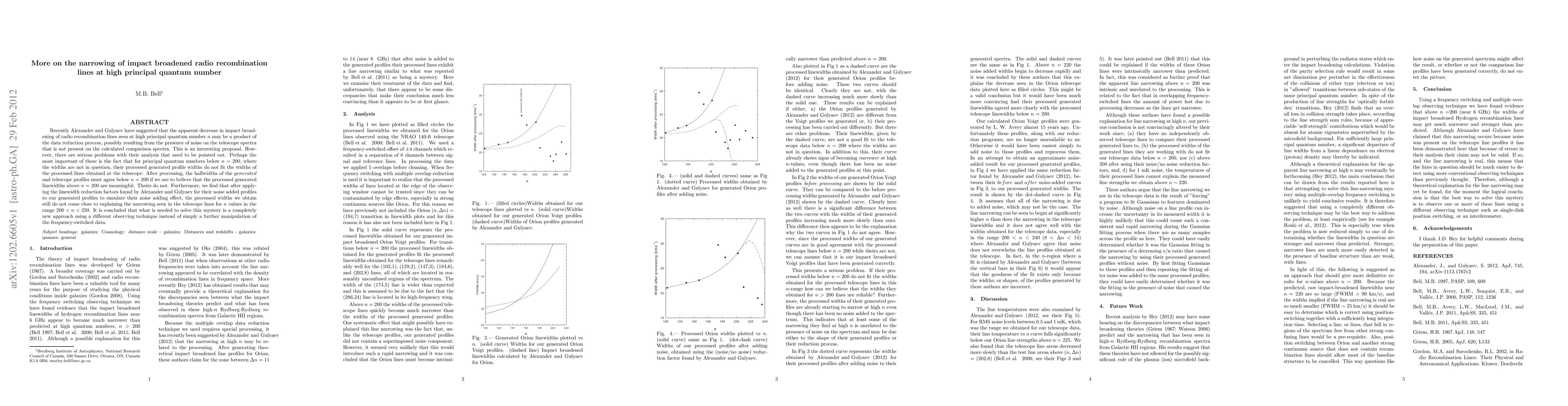 This paper critiques the suggestion that the narrowing of radio recombination line impact broadening at high principal quantum numbers is due to data reduction noise. It finds significant discrepancies in the analysis, particularly for quantum numbers below n = 200, and concludes that a new observing technique is needed to resolve the observed phenomenon.