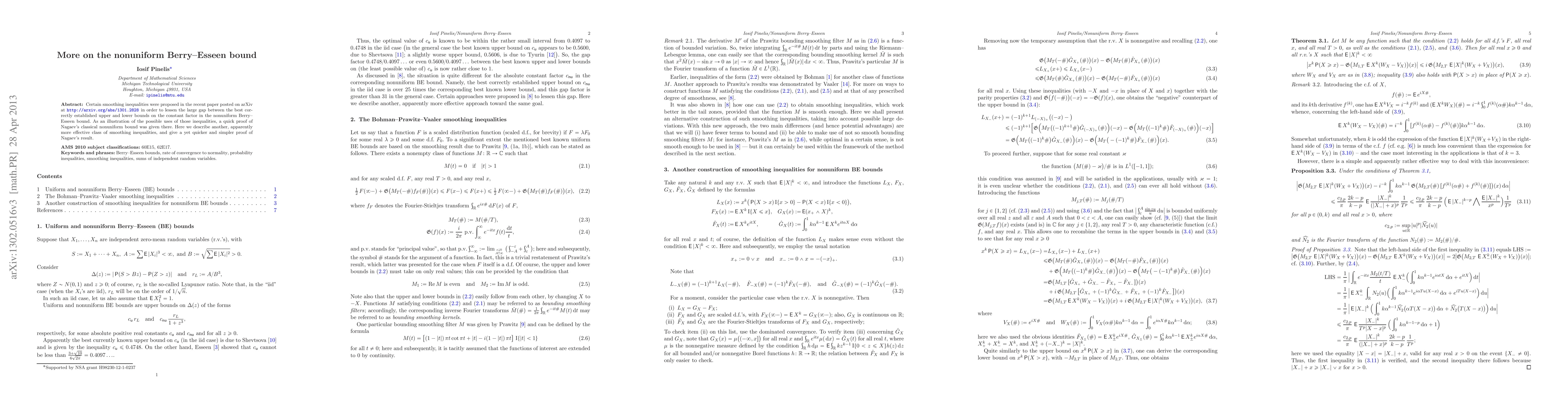 Certain smoothing inequalities were proposed in the recent paper posted on arXiv at arxiv:1301.2828 in order to lessen the very large gap between the best correctly established upper and lower bounds on the constant factor in the nonuniform Berry-Esseen bound. As an illustration of the possible uses of those inequalities, a quick proof of Nagaev's classical nonuniform bound was given there. Here we describe another, apparently more effective class of smoothing inequalities, and give a yet quicker and simpler proof of Nagaev's result.