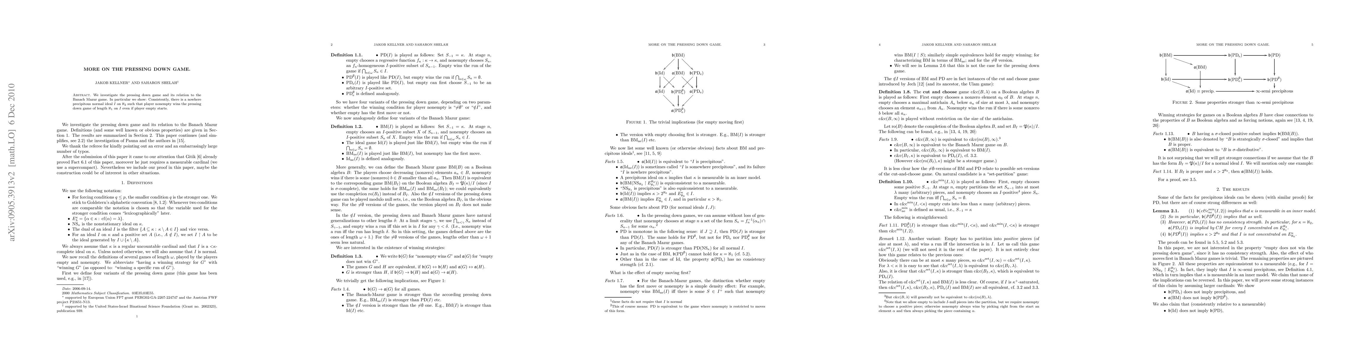 Summary: This paper explores the pressing down game and its connection to the Banach Mazur game, demonstrating that under certain conditions, a nowhere precipitous normal ideal on $\aleph_2$ allows the nonempty player to win the pressing down game of length $\aleph_1$ despite starting empty.