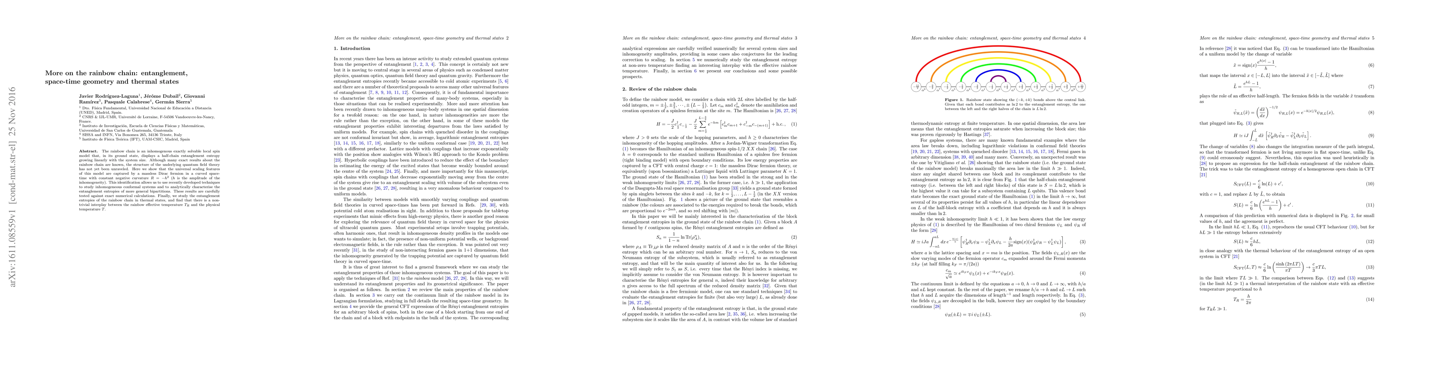 The rainbow chain is an inhomogenous exactly solvable local spin model that, in its ground state, displays a half-chain entanglement entropy growing linearly with the system size. Although many exact results about the rainbow chain are known, the structure of the underlying quantum field theory has not yet been unraveled. Here we show that the universal scaling features of this model are captured by a massless Dirac fermion in a curved space-time with constant negative curvature $R=-h^2$ ($h$ is the amplitude of the inhomogeneity). This identification allows us to use recently developed techniques to study inhomogeneous conformal systems and to analytically characterise the entanglement entropies of more general bipartitions. These results are carefully tested against exact numerical calculations. Finally, we study the entanglement entropies of the rainbow chain in thermal states, and find that there is a non-trivial interplay between the rainbow effective temperature $T_R$ and the physical temperature $T$.