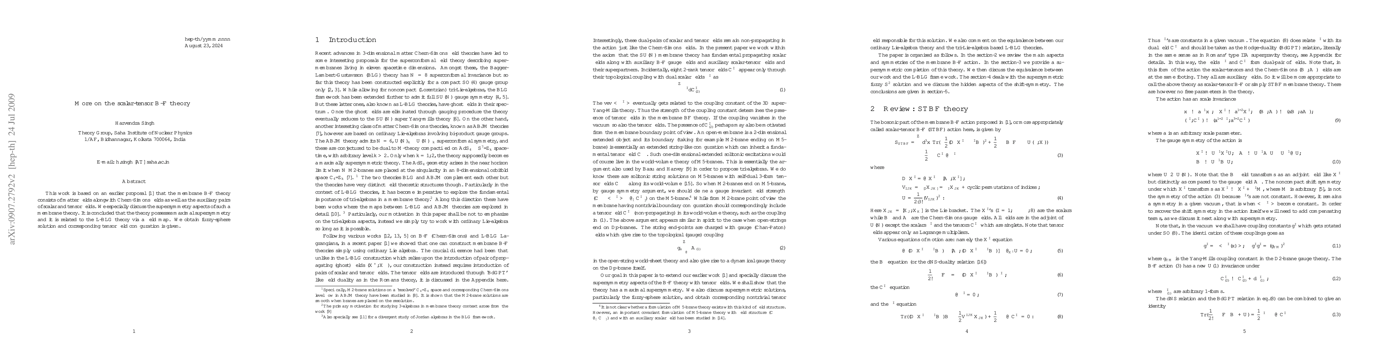 This paper extends the scalar-tensor B-F theory by incorporating matter fields, Chern-Simons fields, and auxiliary scalar and tensor fields, focusing on its maximal supersymmetry and its relation to the L-BLG theory through a field map. A fuzzy-sphere solution is derived along with the corresponding tensor field configuration.