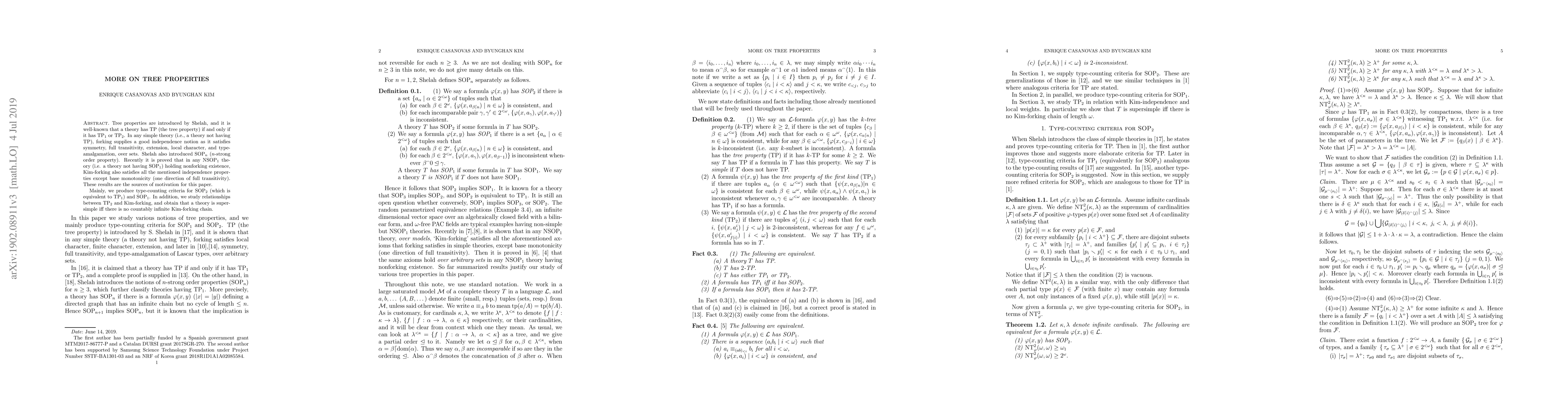 Tree properties are introduced by Shelah, and it is well-known that a theory has TP (the tree property) if and only if it has TP$_1$ or TP$_2$. In any simple theory (i.e., a theory not having TP), forking supplies a good independence notion as it satisfies symmetry, transitivity, extension, local character, and type-amalgamation. Shelah also introduced SOP$_n$ ($n$-strong order property). Recently it is proved that in any NSOP$_1$ theory (i.e. a theory not having SOP$_1$) holding nonforking existence, Kim-forking also satisfies all the mentioned independence properties except base monotonicity (one direction of transitivity). These results are the sources of motivation for this paper. Mainly, we produce type-counting criteria for SOP$_2$ (which is equivalent to TP$_1$) and SOP$_1$. In addition, we study relationships between TP$_2$ and Kim-forking, and obtain that a theory is supersimple iff there is no countably infinite Kim-forking chain.