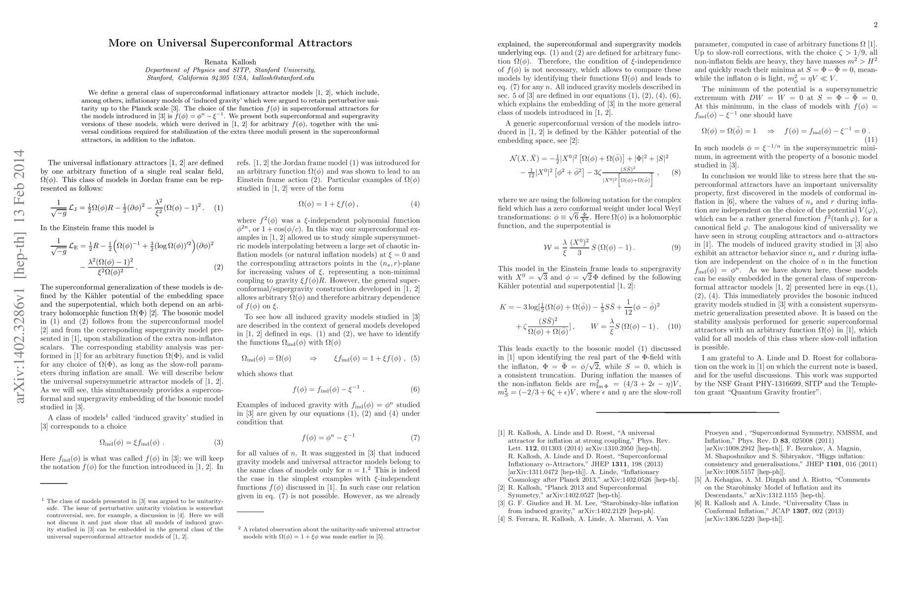 We define a general class of superconformal inflationary attractor models studied in our previous papers [1,2], which include, among others, inflationary models of 'induced gravity' which were argued to retain perturbative unitarity up to the Planck scale [3]. The choice of the function $f(\phi)$ in superconformal attractors for the models introduced in [3] is $f(\phi)= \phi^n - \xi^{-1}$. We present both superconformal and supergravity versions of these models, which were derived in [1,2] for arbitrary $f(\phi)$, together with the universal conditions required for stabilization of the extra three moduli present in the superconformal attractors, in addition to the inflaton.