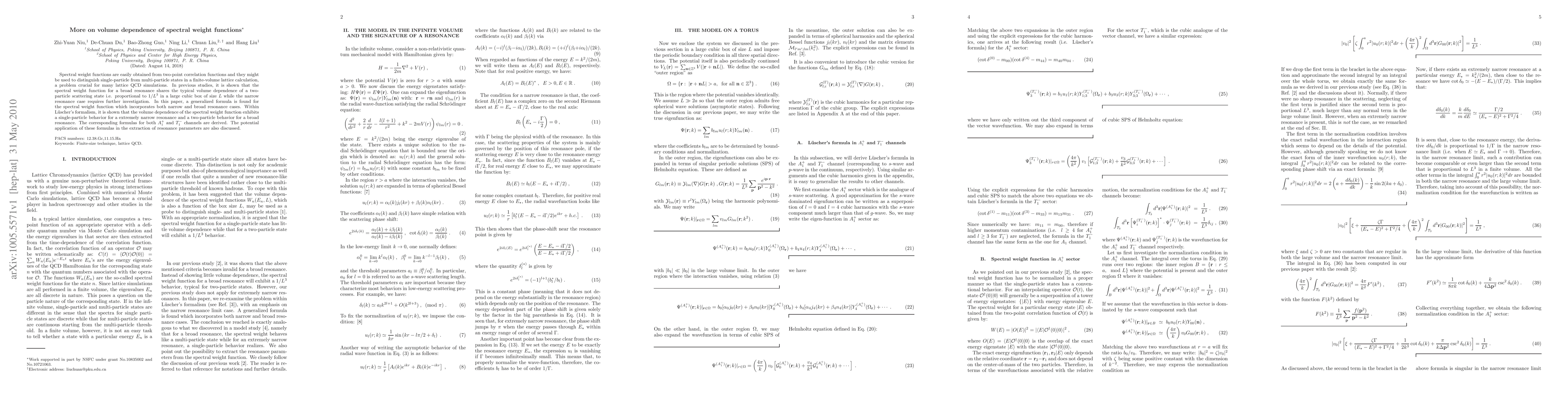 Spectral weight functions are easily obtained from two-point correlation functions and they might be used to distinguish single-particle from multi-particle states in a finite-volume lattice calculation, a problem crucial for many lattice QCD simulations. In previous studies, it is shown that the spectral weight function for a broad resonance shares the typical volume dependence of a two-particle scattering state i.e. proportional to $1/L^3$ in a large cubic box of size $L$ while the narrow resonance case requires further investigation. In this paper, a generalized formula is found for the spectral weight function which incorporates both narrow and broad resonance cases. Within L\"uscher's formalism, it is shown that the volume dependence of the spectral weight function exhibits a single-particle behavior for a extremely narrow resonance and a two-particle behavior for a broad resonance. The corresponding formulas for both $A^+_1$ and $T^-_1$ channels are derived. The potential application of these formulas in the extraction of resonance parameters are also discussed.