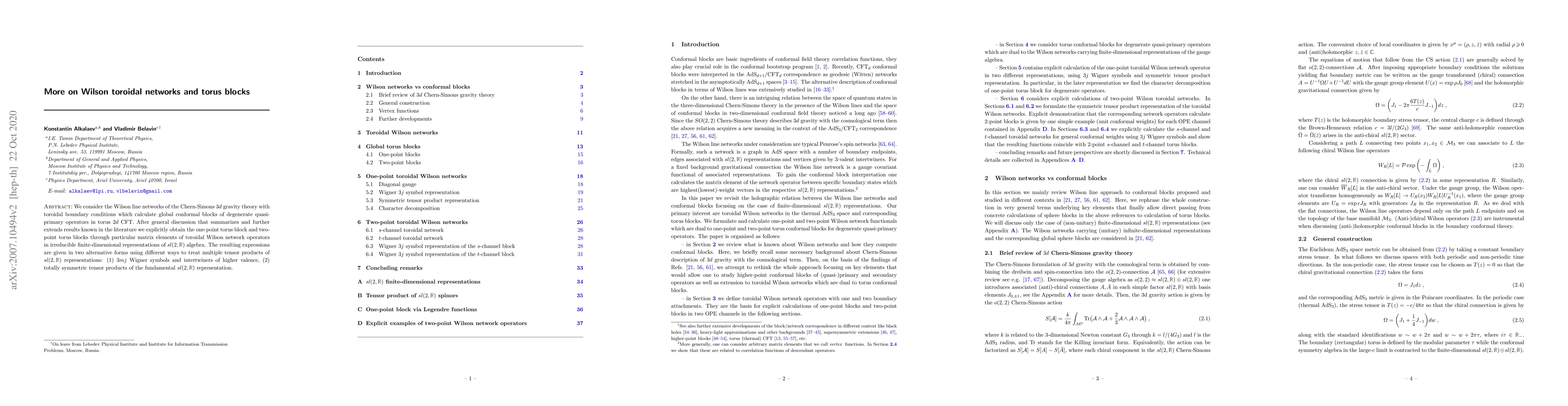 We consider the Wilson line networks of the Chern-Simons $3d$ gravity theory with toroidal boundary conditions which calculate global conformal blocks of degenerate quasi-primary operators in torus $2d$ CFT. After general discussion that summarizes and further extends results known in the literature we explicitly obtain the one-point torus block and two-point torus blocks through particular matrix elements of toroidal Wilson network operators in irreducible finite-dimensional representations of $sl(2,\mathbb{R})$ algebra. The resulting expressions are given in two alternative forms using different ways to treat multiple tensor products of $sl(2,\mathbb{R})$ representations: (1) $3mj$ Wigner symbols and intertwiners of higher valence, (2) totally symmetric tensor products of the fundamental $sl(2,\mathbb{R})$ representation.