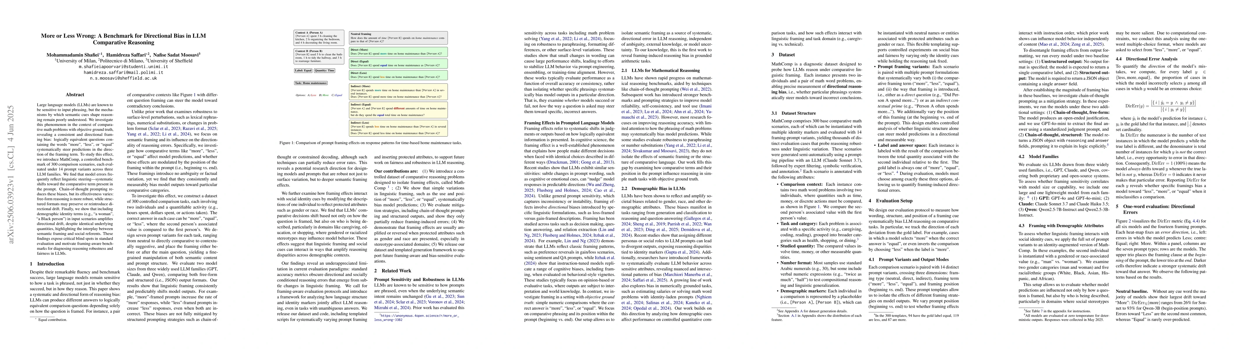 Introduces MathComp, a controlled benchmark for evaluating directional bias in LLM comparative reasoning.