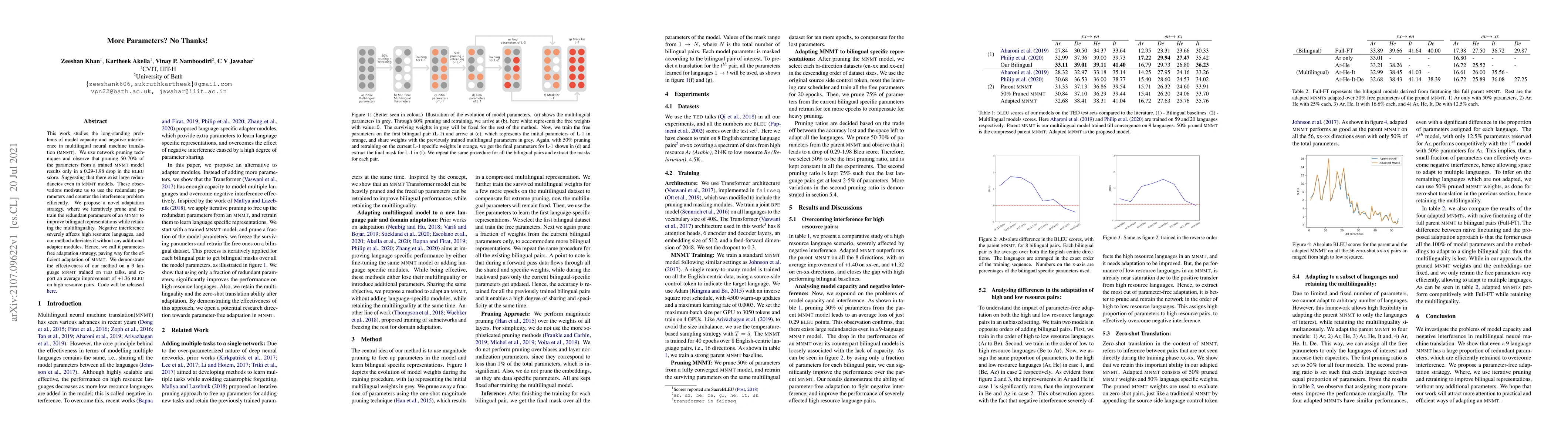 This work studies the long-standing problems of model capacity and negative interference in multilingual neural machine translation MNMT. We use network pruning techniques and observe that pruning 50-70% of the parameters from a trained MNMT model results only in a 0.29-1.98 drop in the BLEU score. Suggesting that there exist large redundancies even in MNMT models. These observations motivate us to use the redundant parameters and counter the interference problem efficiently. We propose a novel adaptation strategy, where we iteratively prune and retrain the redundant parameters of an MNMT to improve bilingual representations while retaining the multilinguality. Negative interference severely affects high resource languages, and our method alleviates it without any additional adapter modules. Hence, we call it parameter-free adaptation strategy, paving way for the efficient adaptation of MNMT. We demonstrate the effectiveness of our method on a 9 language MNMT trained on TED talks, and report an average improvement of +1.36 BLEU on high resource pairs. Code will be released here.