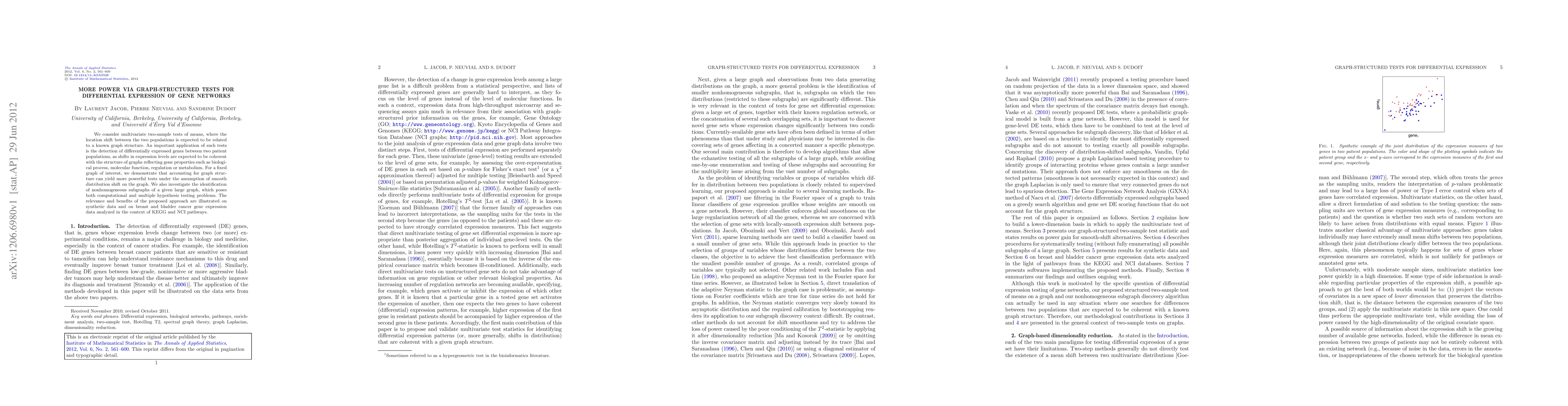 We consider multivariate two-sample tests of means, where the location shift between the two populations is expected to be related to a known graph structure. An important application of such tests is the detection of differentially expressed genes between two patient populations, as shifts in expression levels are expected to be coherent with the structure of graphs reflecting gene properties such as biological process, molecular function, regulation or metabolism. For a fixed graph of interest, we demonstrate that accounting for graph structure can yield more powerful tests under the assumption of smooth distribution shift on the graph. We also investigate the identification of nonhomogeneous subgraphs of a given large graph, which poses both computational and multiple hypothesis testing problems. The relevance and benefits of the proposed approach are illustrated on synthetic data and on breast and bladder cancer gene expression data analyzed in the context of KEGG and NCI pathways.