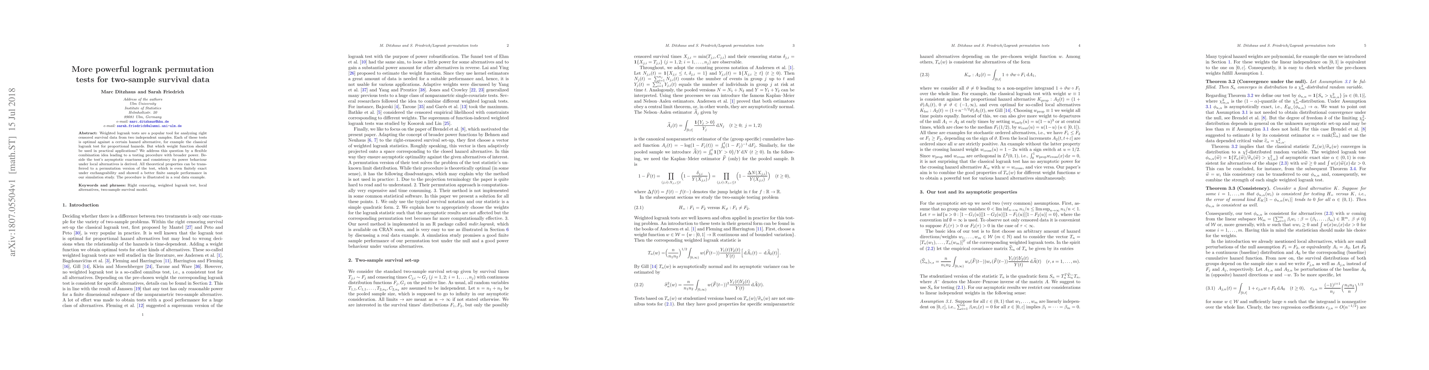 This paper proposes a flexible combination of weighted logrank tests to create a more powerful permutation test for two-sample survival data, demonstrating improved power under local alternatives and better finite sample performance compared to traditional methods. The new procedure maintains asymptotic exactness and consistency.