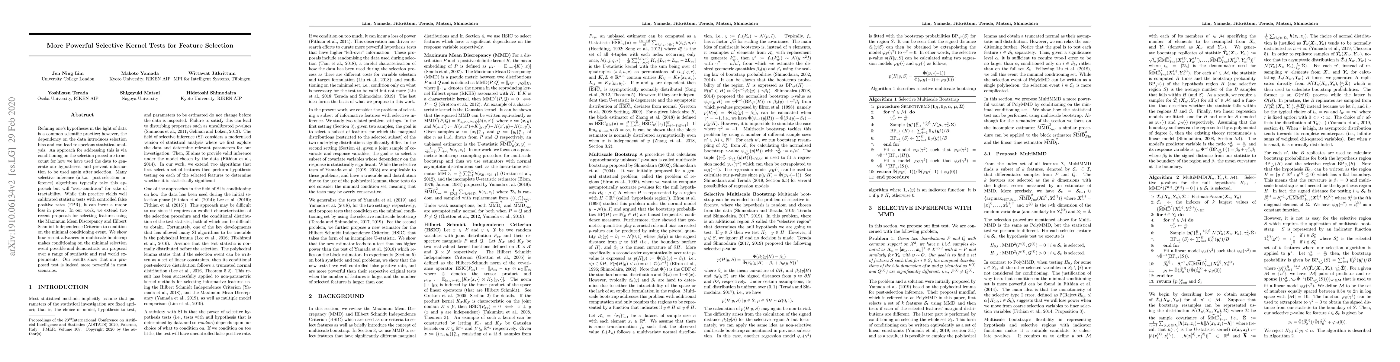 Refining one's hypotheses in the light of data is a common scientific practice; however, the dependency on the data introduces selection bias and can lead to specious statistical analysis. An approach for addressing this is via conditioning on the selection procedure to account for how we have used the data to generate our hypotheses, and prevent information to be used again after selection. Many selective inference (a.k.a. post-selection inference) algorithms typically take this approach but will "over-condition" for sake of tractability. While this practice yields well calibrated statistic tests with controlled false positive rates (FPR), it can incur a major loss in power. In our work, we extend two recent proposals for selecting features using the Maximum Mean Discrepancy and Hilbert Schmidt Independence Criterion to condition on the minimal conditioning event. We show how recent advances in multiscale bootstrap makes conditioning on the minimal selection event possible and demonstrate our proposal over a range of synthetic and real world experiments. Our results show that our proposed test is indeed more powerful in most scenarios.