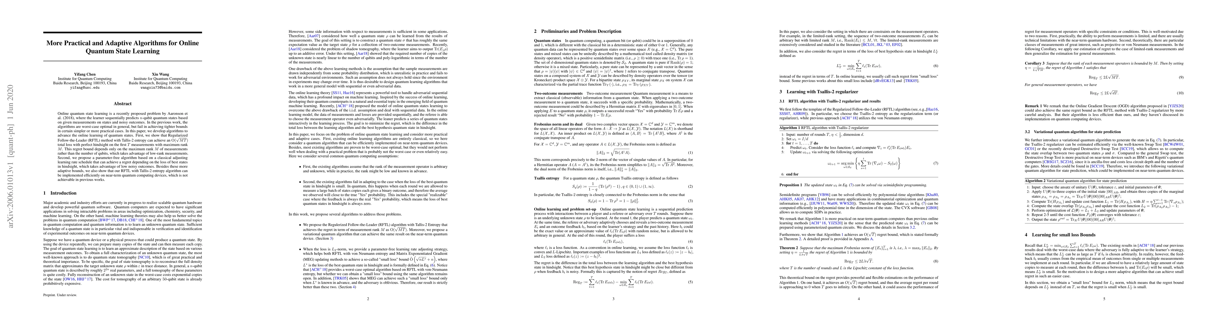 Online quantum state learning is a recently proposed problem by Aaronson et al. (2018), where the learner sequentially predicts $n$-qubit quantum states based on given measurements on states and noisy outcomes. In the previous work, the algorithms are worst-case optimal in general but fail in achieving tighter bounds in certain simpler or more practical cases. In this paper, we develop algorithms to advance the online learning of quantum states. First, we show that Regularized Follow-the-Leader (RFTL) method with Tallis-2 entropy can achieve an $O(\sqrt{MT})$ total loss with perfect hindsight on the first $T$ measurements with maximum rank $M$. This regret bound depends only on the maximum rank $M$ of measurements rather than the number of qubits, which takes advantage of low-rank measurements. Second, we propose a parameter-free algorithm based on a classical adjusting learning rate schedule that can achieve a regret depending on the loss of best states in hindsight, which takes advantage of low noisy outcomes. Besides these more adaptive bounds, we also show that our RFTL with Tallis-2 entropy algorithm can be implemented efficiently on near-term quantum computing devices, which is not achievable in previous works.