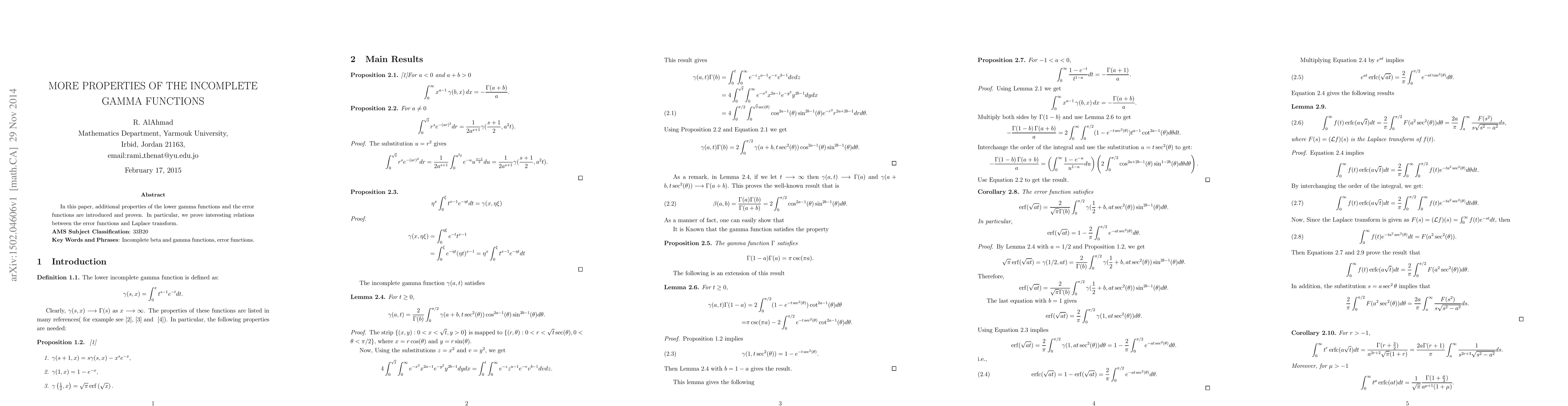 In this paper, additional properties of the lower gamma functions and the error functions are introduced and proven. In particular, we prove interesting relations between the error functions and Laplace transform.