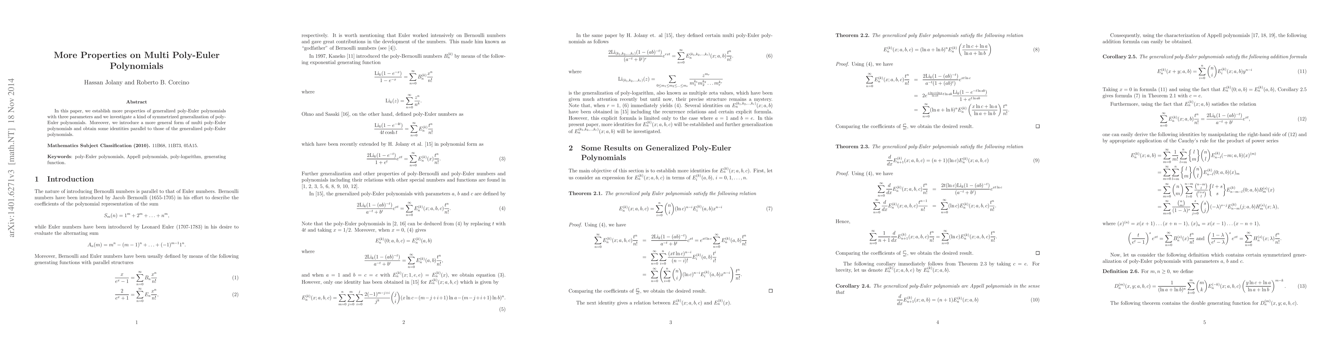 This paper establishes additional properties of generalized poly-Euler polynomials with three parameters and explores a symmetrized generalization. It introduces a more general form of multi poly-Euler polynomials and derives identities similar to those of the generalized poly-Euler polynomials.