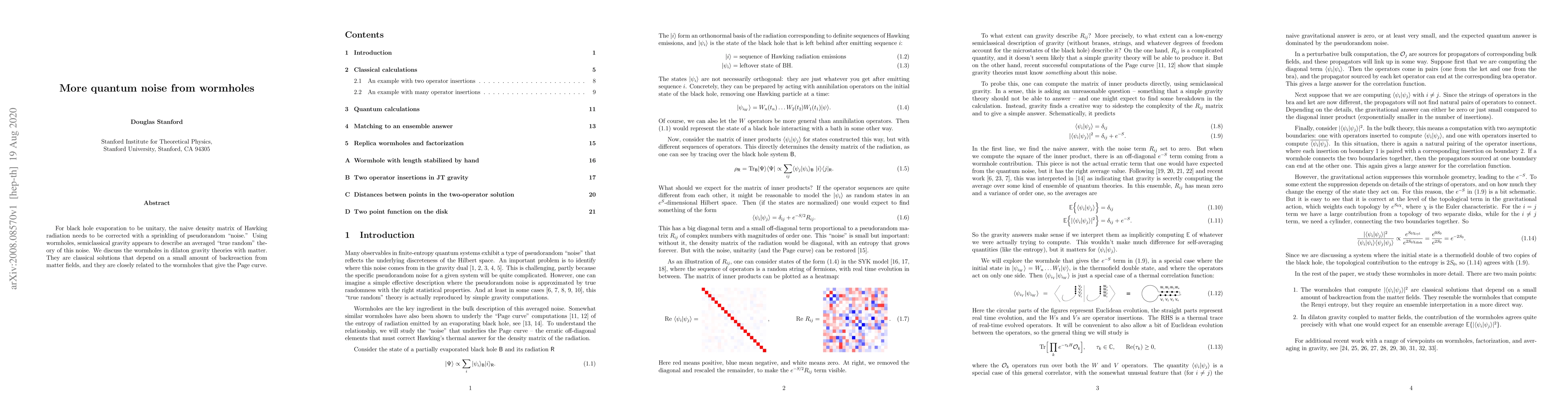For black hole evaporation to be unitary, the naive density matrix of Hawking radiation needs to be corrected with a sprinkling of pseudorandom "noise." Using wormholes, semiclassical gravity appears to describe an averaged "true random" theory of this noise. We discuss the wormholes in dilaton gravity theories with matter. They are classical solutions that depend on a small amount of backreaction from matter fields, and they are closely related to the wormholes that give the Page curve.