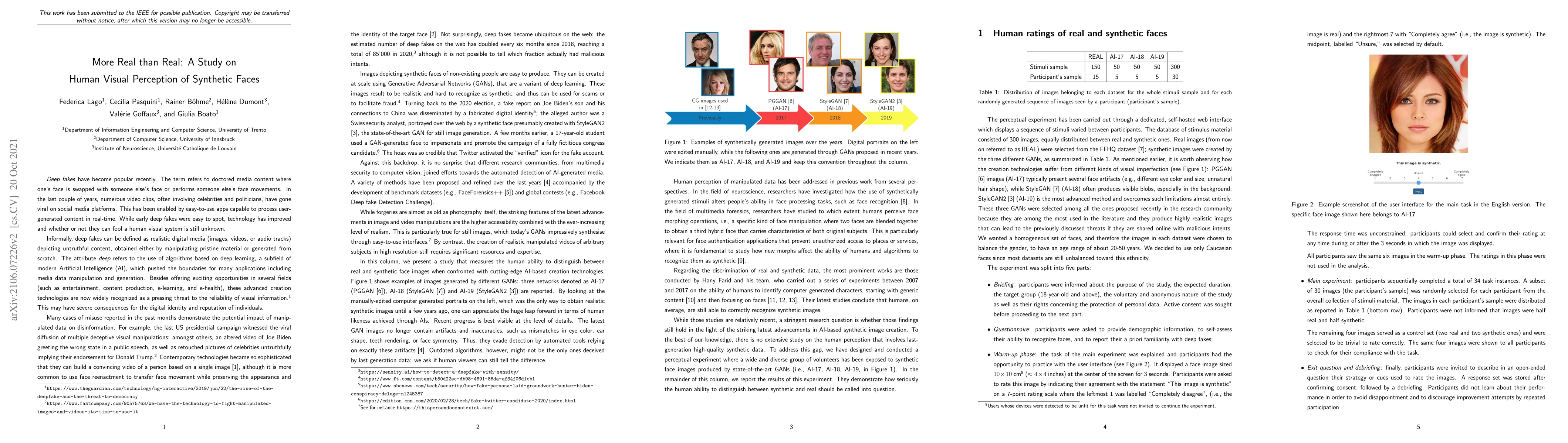 Deep fakes became extremely popular in the last years, also thanks to their increasing realism. Therefore, there is the need to measures human's ability to distinguish between real and synthetic face images when confronted with cutting-edge creation technologies. We describe the design and results of a perceptual experiment we have conducted, where a wide and diverse group of volunteers has been exposed to synthetic face images produced by state-of-the-art Generative Adversarial Networks (namely, PG-GAN, StyleGAN, StyleGAN2). The experiment outcomes reveal how strongly we should call into question our human ability to discriminate real faces from synthetic ones generated through modern AI.
