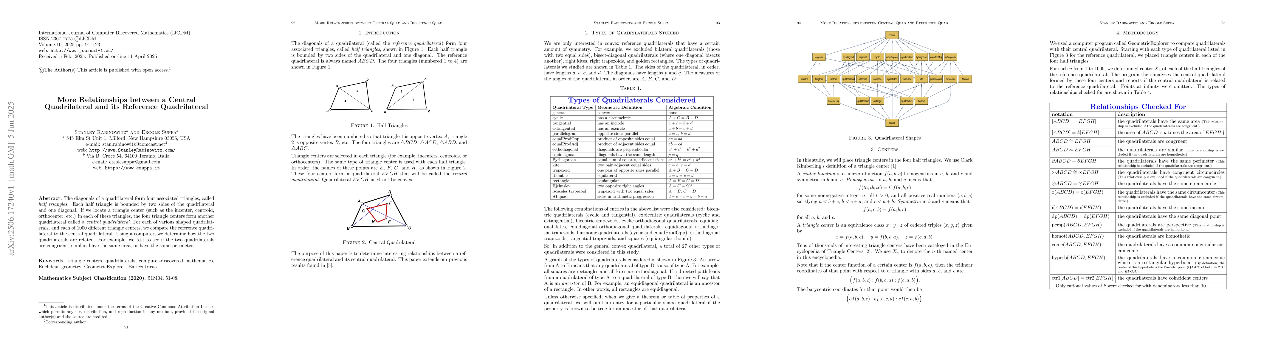 This research uses computer simulations to explore relationships between a central quadrilateral formed by triangle centers in a quadrilateral's half-triangles and its reference quadrilateral. It tests for congruence, similarity, equal area, and equal perimeter across various quadrilateral shapes and 1000 triangle centers.