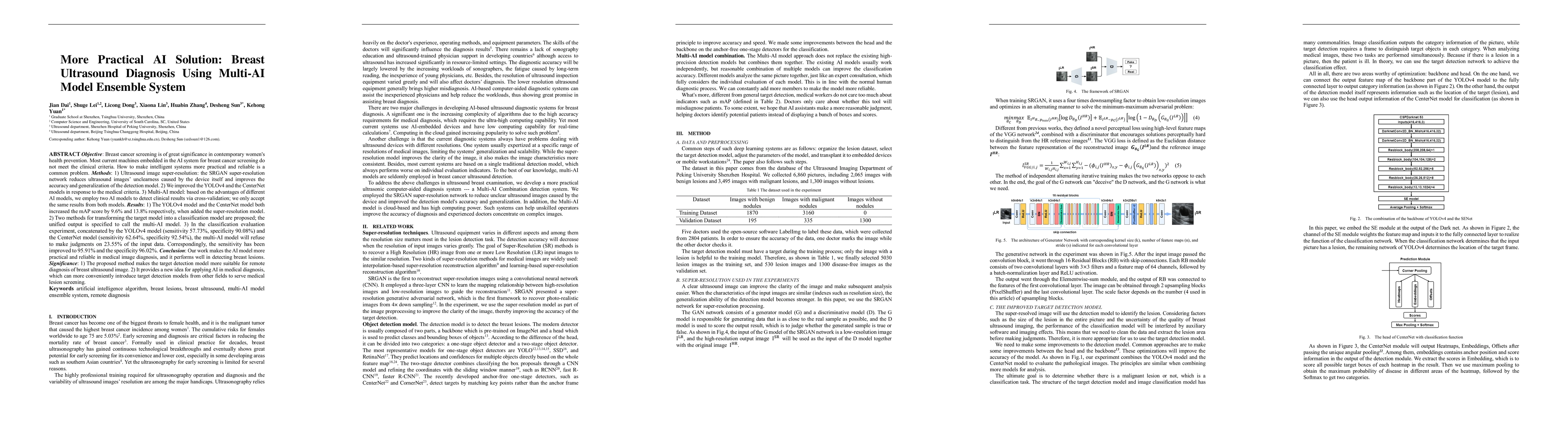 This research proposes a multi-AI combination approach to enhance the reliability of breast ultrasound diagnosis. By employing super-resolution networks, improved YOLOv4 and CenterNet models, and a multi-AI decision-making system, the study significantly boosts the sensitivity and specificity of breast cancer detection, achieving 95.91% sensitivity and 96.02% specificity.