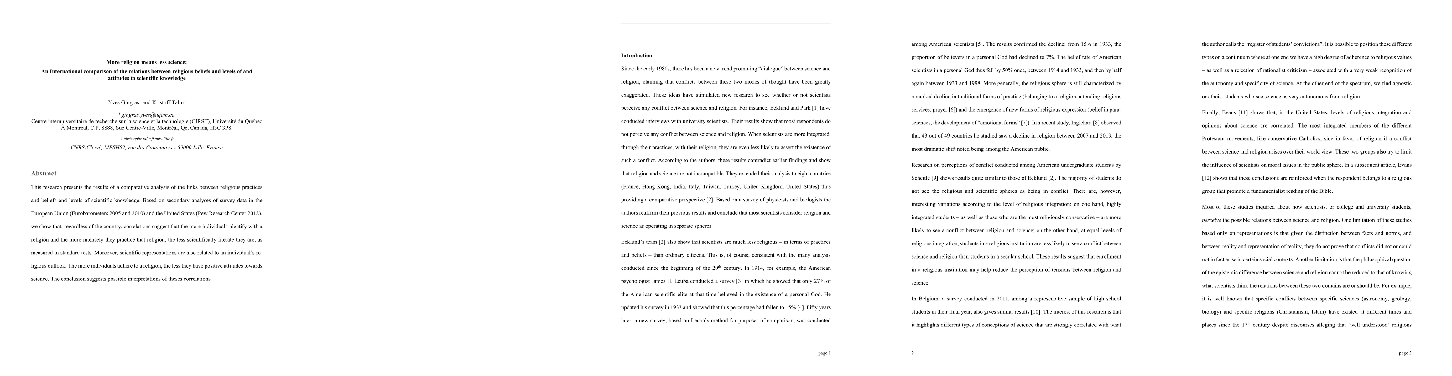 This research presents the results of a comparative analysis of the links between religious practices and beliefs and levels of scientific knowledge. Based on secondary analyses of survey data in the European Union (Eurobarometers 2005 and 2010) and the United States (Pew Research Center 2018), we show that, regardless of the country, correlations suggest that the more individuals identify with a religion and the more intensely they practice that religion, the less scientifically literate they are, as measured in standard tests. Moreover, scientific representations are also related to individual religious outlook. The more individuals adhere to a religion, the less they have positive attitudes towards science. The conclusion suggests possible interpretations of theses correlations.