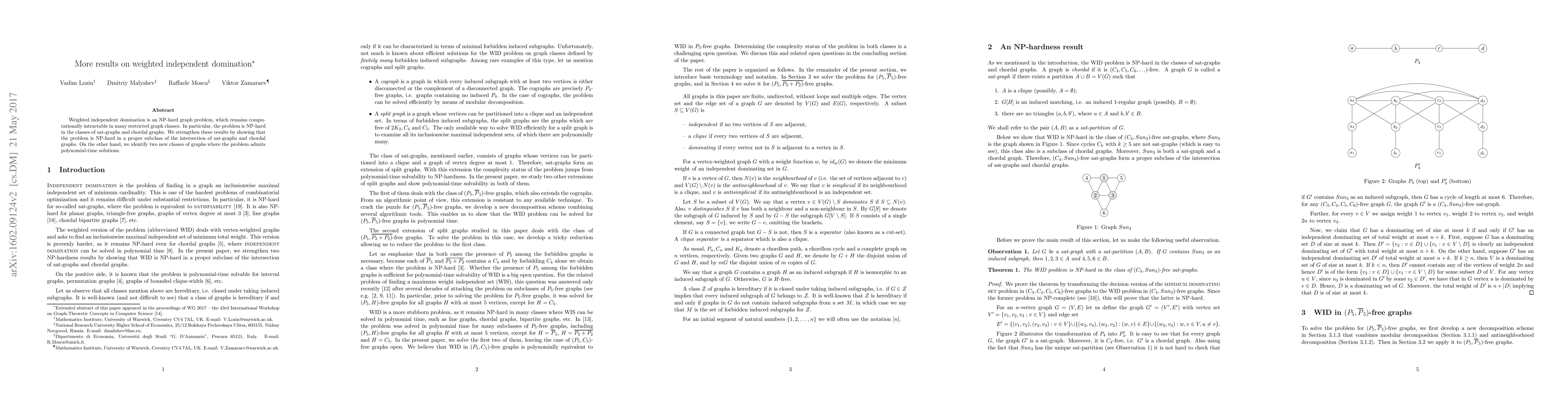 Weighted independent domination is an NP-hard graph problem, which remains computationally intractable in many restricted graph classes. In particular, the problem is NP-hard in the classes of sat-graphs and chordal graphs. We strengthen these results by showing that the problem is NP-hard in a proper subclass of the intersection of sat-graphs and chordal graphs. On the other hand, we identify two new classes of graphs where the problem admits polynomial-time solutions.