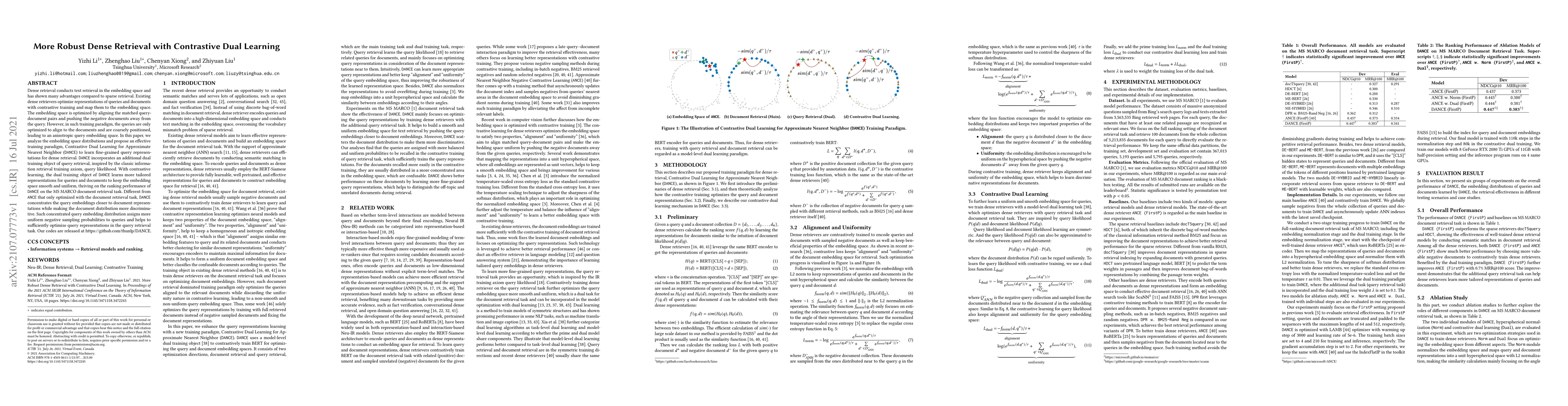 This paper proposes Contrastive Dual Learning for Approximate Nearest Neighbor (DANCE) to enhance dense retrieval by learning fine-grained query representations. Unlike existing methods, DANCE optimizes both query and document embeddings through dual training, resulting in a smoother and more uniform embedding space, which improves retrieval performance on the MS MARCO task.