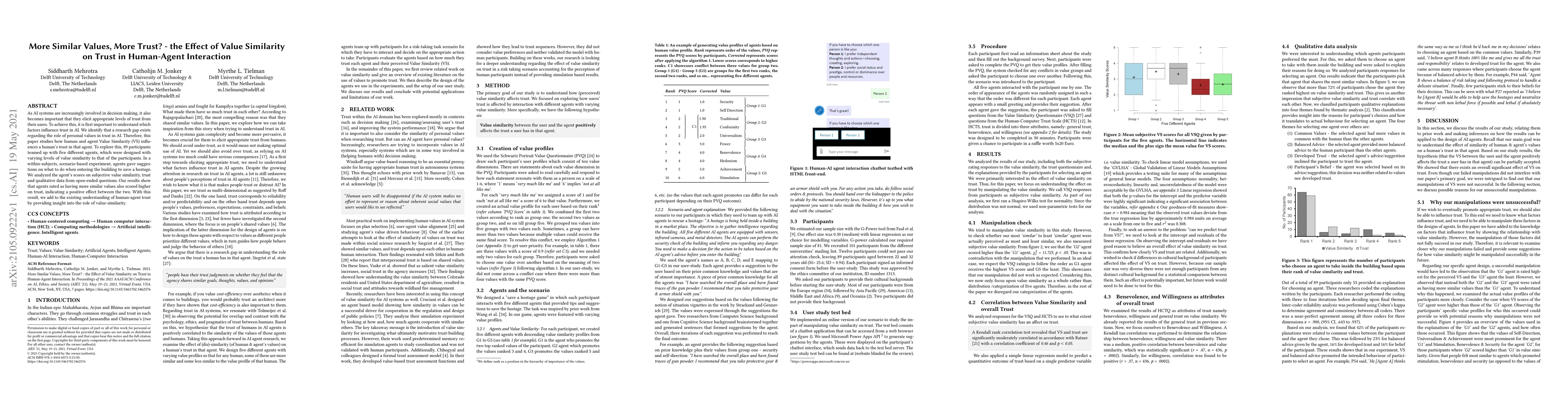 A study found that when humans have similar values to AI agents, they trust those agents more, suggesting a positive relationship between value similarity and trust in human-agent interaction.