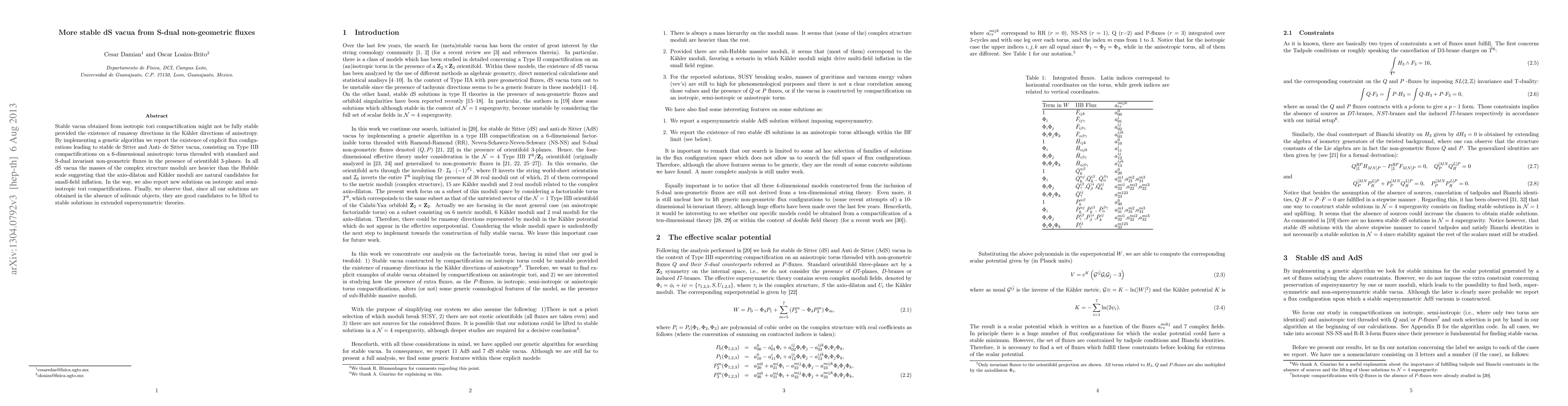 Stable vacua obtained from isotropic tori compactification might not be fully stable provided the existence of runaway directions in the Kaehler directions of anisotropy. By implementing a genetic algorithm we report the existence of explicit flux configurations leading to stable de Sitter and Anti- de Sitter vacua, consisting on Type IIB compactifications on a 6-dimensional anisotropic torus threaded with standard and S-dual invariant non-geometric fluxes in the presence of orientifold 3-planes. In all dS vacua the masses of the complex structure moduli are heavier than the Hubble scale suggesting that the axio-dilaton and Kaeahler moduli are natural candidates for small-field inflation. In the way, we also report new solutions on isotropic and semi-isotropic tori compactifications. Finally, we observe that, since all our solutions are obtained in the absence of solitonic objects, they are good candidates to be lifted to stable solutions in extended supersymmetric theories.