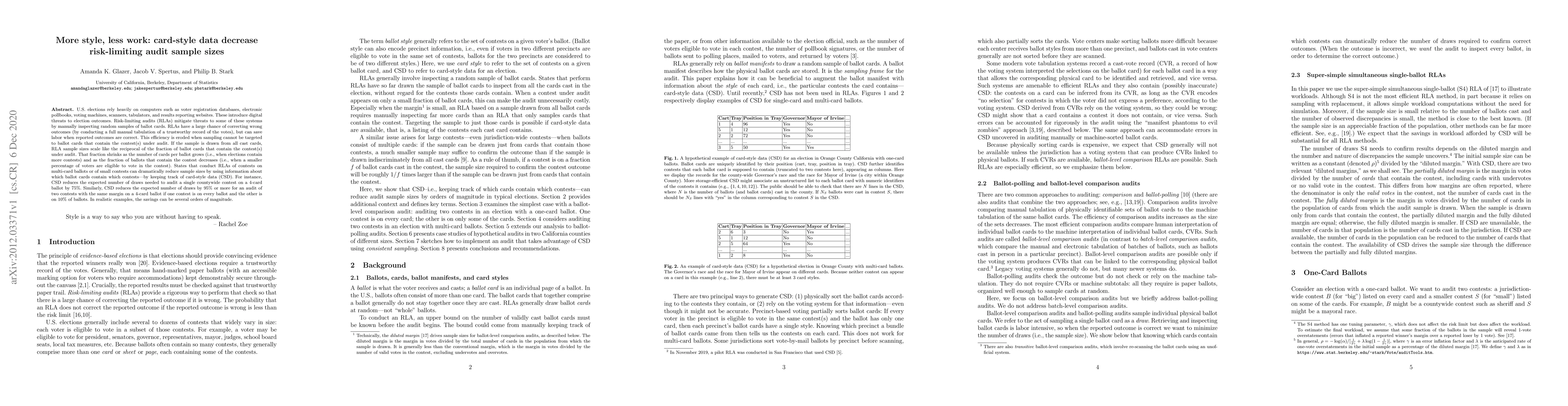 U.S. elections rely heavily on computers such as voter registration databases, electronic pollbooks, voting machines, scanners, tabulators, and results reporting websites. These introduce digital threats to election outcomes. Risk-limiting audits (RLAs) mitigate threats to some of these systems by manually inspecting random samples of ballot cards. RLAs have a large chance of correcting wrong outcomes (by conducting a full manual tabulation of a trustworthy record of the votes), but can save labor when reported outcomes are correct. This efficiency is eroded when sampling cannot be targeted to ballot cards that contain the contest(s) under audit. If the sample is drawn from all cast cards, RLA sample sizes scale like the reciprocal of the fraction of ballot cards that contain the contest(s) under audit. That fraction shrinks as the number of cards per ballot grows (i.e., when elections contain more contests) and as the fraction of ballots that contain the contest decreases (i.e., when a smaller percentage of voters are eligible to vote in the contest). States that conduct RLAs of contests on multi-card ballots or of small contests can dramatically reduce sample sizes by using information about which ballot cards contain which contests -- by keeping track of card-style data (CSD). For instance, CSD reduces the expected number of draws needed to audit a single countywide contest on a 4-card ballot by 75%. Similarly, CSD reduces the expected number of draws by 95% or more for an audit of two contests with the same margin on a 4-card ballot if one contest is on every ballot and the other is on 10% of ballots. In realistic examples, the savings can be several orders of magnitude.