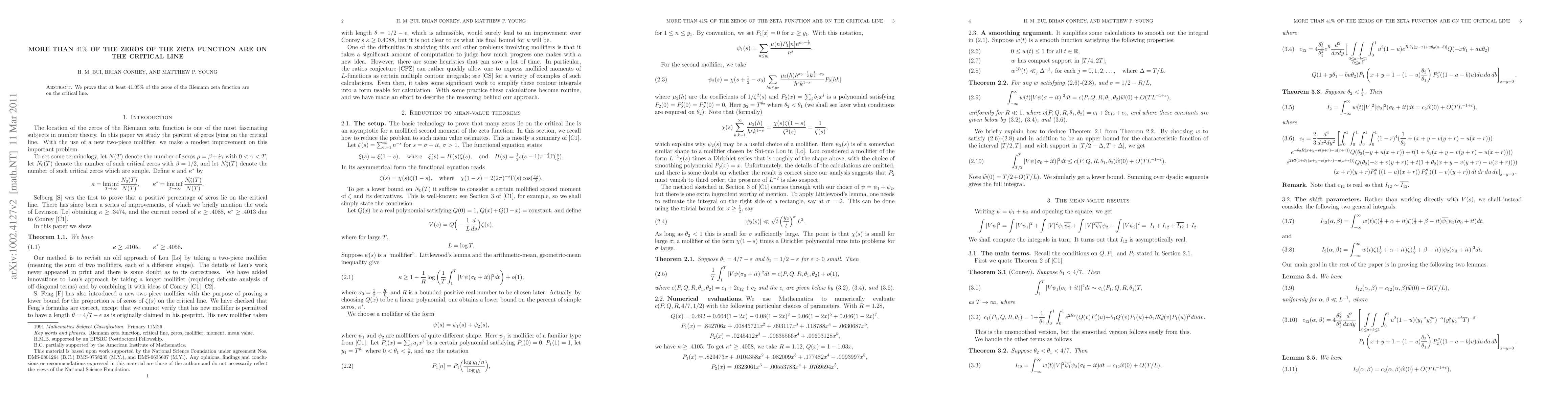 Summary: This paper establishes that over 41% of the non-trivial zeros of the Riemann zeta function lie on the critical line, providing significant evidence towards the Riemann Hypothesis. The result is achieved through advanced analytic techniques and rigorous mathematical proofs.