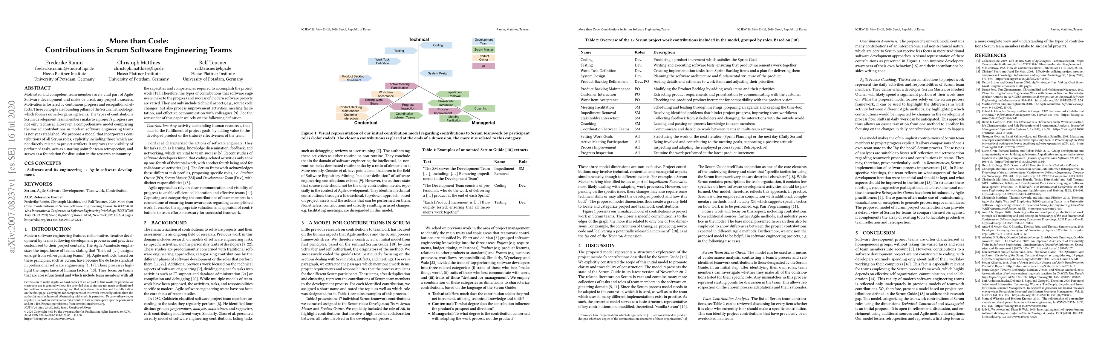 The proposed model categorizes Scrum team work contributions using three non-exclusive dimensions: Technical, Contentual, and Managerial, making implicit contributions explicit and fostering self-reflection and retrospection regarding teamwork processes and contributions.