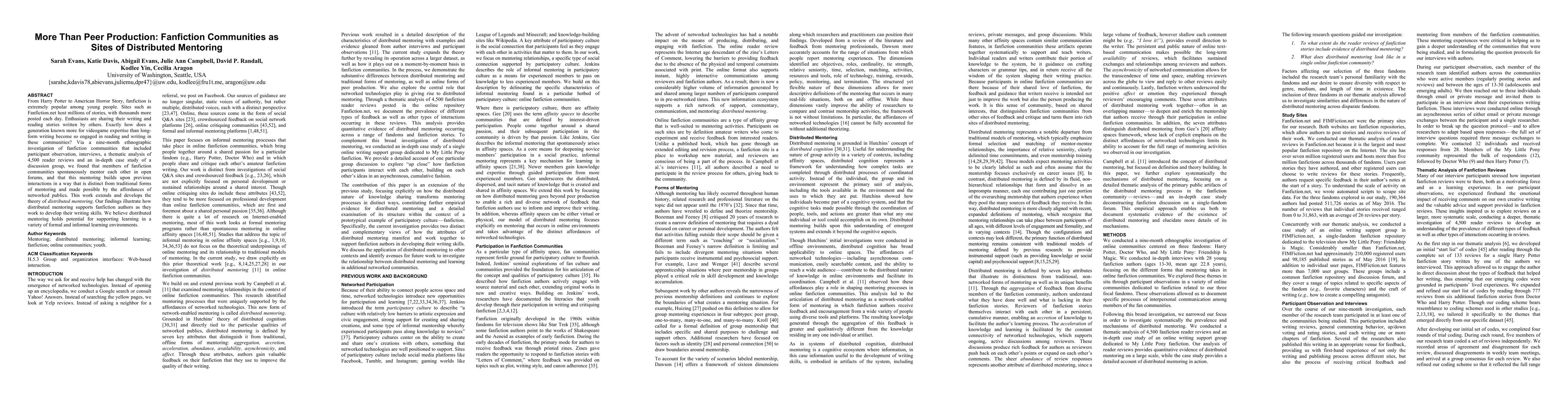 This study explores how fanfiction communities facilitate distributed mentoring among young participants, revealing that members spontaneously provide each other with guidance in open forums, distinct from traditional mentoring and enabled by networked publics. The findings suggest that such peer-driven mentoring could enhance learning across diverse educational settings.