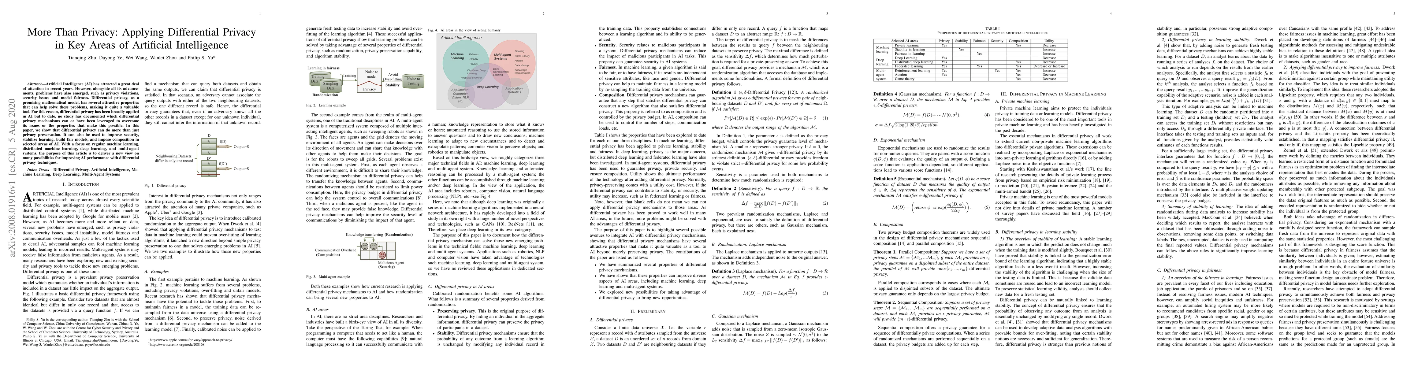 Artificial Intelligence (AI) has attracted a great deal of attention in recent years. However, alongside all its advancements, problems have also emerged, such as privacy violations, security issues and model fairness. Differential privacy, as a promising mathematical model, has several attractive properties that can help solve these problems, making it quite a valuable tool. For this reason, differential privacy has been broadly applied in AI but to date, no study has documented which differential privacy mechanisms can or have been leveraged to overcome its issues or the properties that make this possible. In this paper, we show that differential privacy can do more than just privacy preservation. It can also be used to improve security, stabilize learning, build fair models, and impose composition in selected areas of AI. With a focus on regular machine learning, distributed machine learning, deep learning, and multi-agent systems, the purpose of this article is to deliver a new view on many possibilities for improving AI performance with differential privacy techniques.